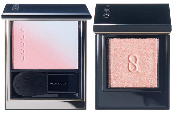 左から:「絶妙なグラデーションで、これだけでほのかな血色とハイライトが完成!」オイルを最小限に抑えて配合。エアリーで柔らかな血色感を実現。ブラーリング カラー ブラッシュ08 ¥6,600、「まぶたの中心部にのせるとさりげない立体感が」大粒パールが均一に肌と調和、華やかな目元に。モノ ルック アイズ L-01 ¥4,290