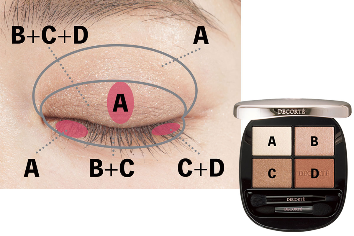 Aを二重幅&アイホール全体にスワイプ塗りし、B+Cを二重幅にのせて仕上げにDを。B+Cは下まぶたにものせて囲み目に。下まぶたの目頭はA、下まぶた目尻はC+Dでキュッと上げて。黒目上にAを。
