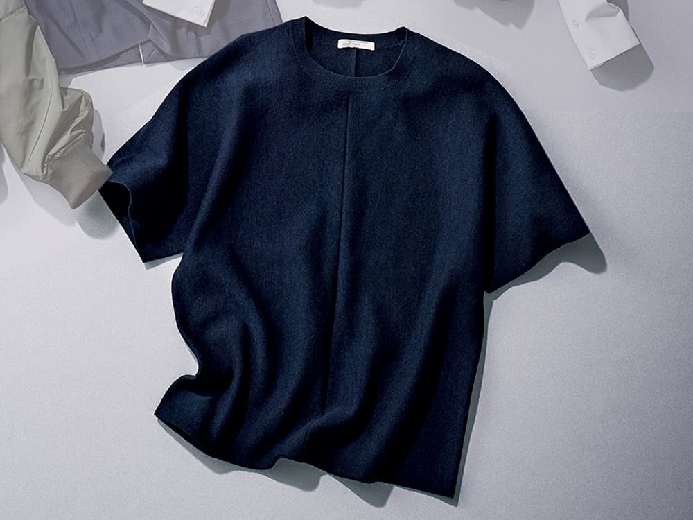センターシームで地味見えしないニット。ボトムスとの相性も良くワンツーコーデの完成度が高まる。体のラインを拾わない点も優秀