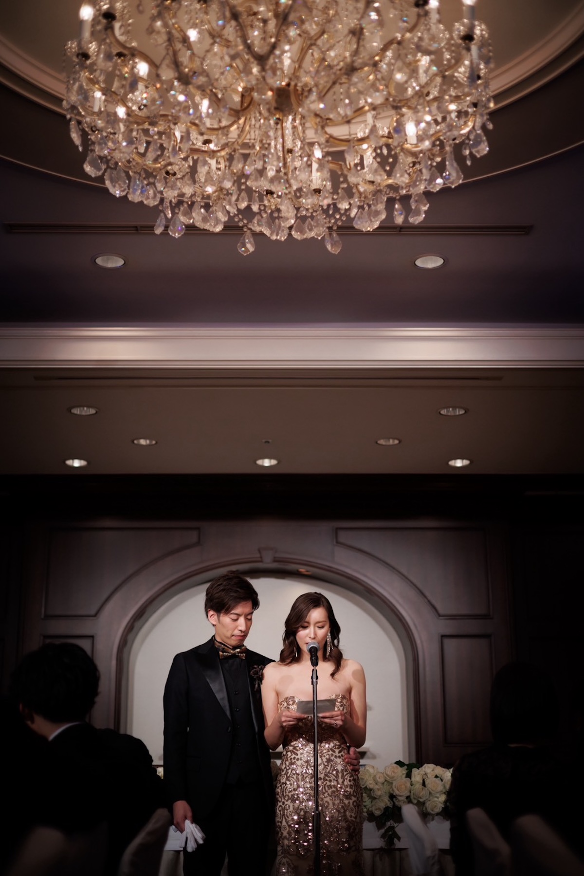 「オールブラックのシャツにゴールドのネクタイで、彼も雰囲気を変えました。暗闇から出てくる入場で、ゴールドのドレスと真っ黒の彼が現れる演出にしたんです」(さくらさん)
