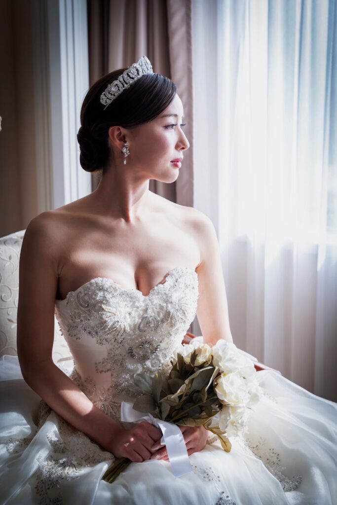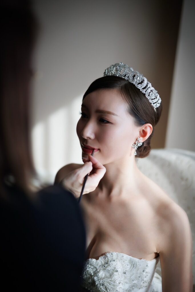 挙式時は、シンプルなアップスタイルにティアラを合わせて華やかに。お色直しでは髪を下ろし、メイクもリップを赤にするなど、印象をガラリと変えました。