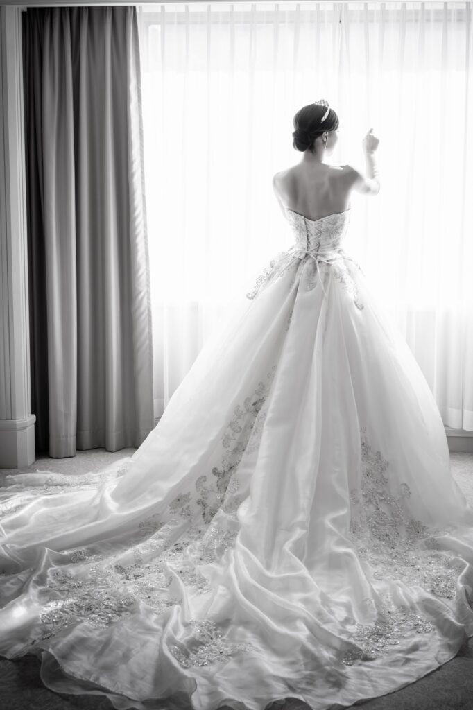 「プリンセスラインで“結婚式らしい”と感じる、王道のドレスを探していました。さらに、ウエストが高い位置でキュッと美しく絞られていて、歩くたびに余韻を残すような長いトレーンがあることも譲れないポイントでした。いろいろ調べた末、ATELIER E&M(アトリエエム)の『raffiller(ラフィリエ)』シリーズに出会いました」(さくらさん)