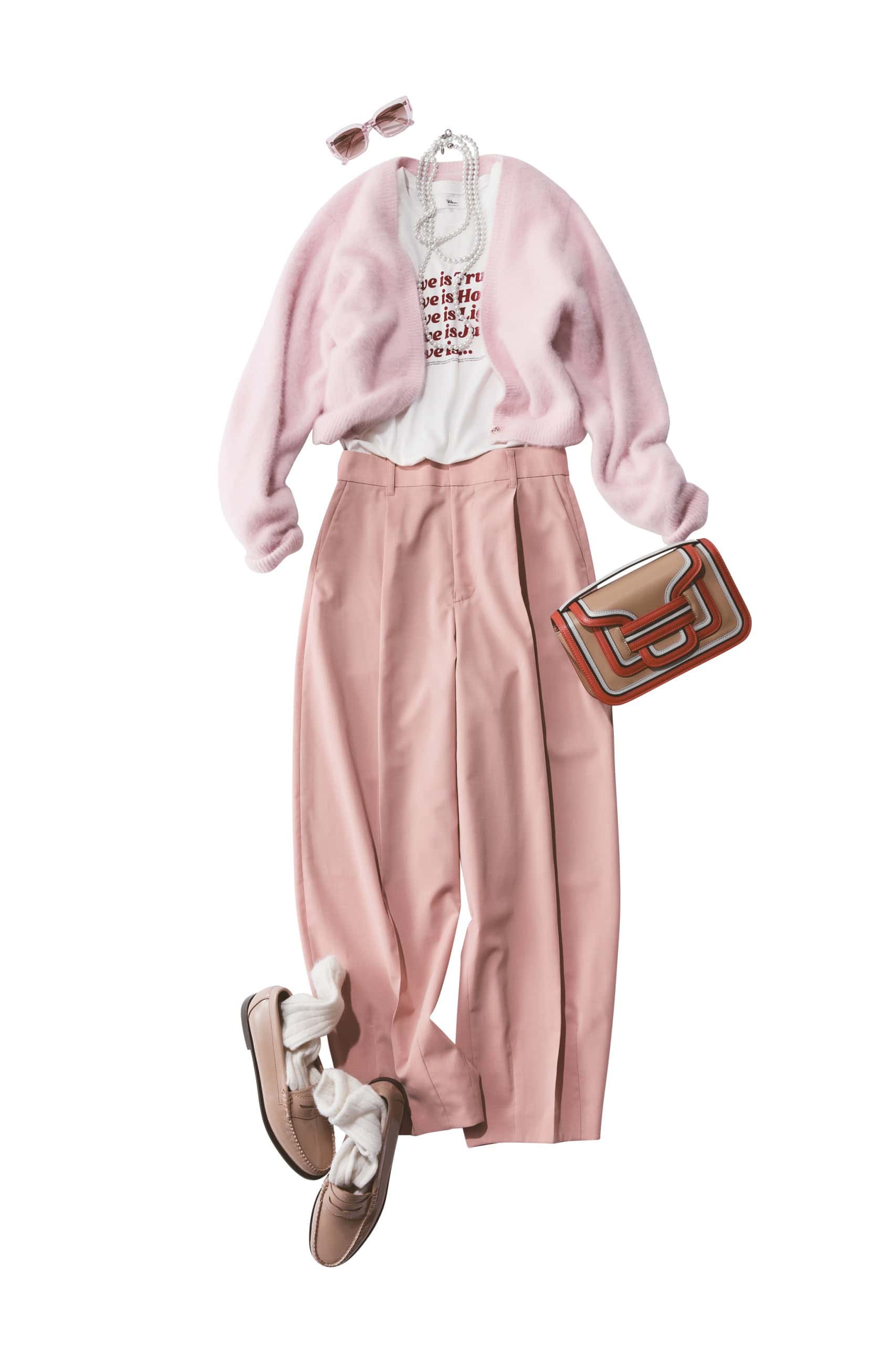はくだけでパッと華やぐ柔らかなピンクのパンツ。ともすると甘さ多めになりそうですが、バレルシルエットならモードにシフトできます。腰高に見えるのも魅力。トーン違いのピンクを重ねたワントーンでまとめれば、甘さがほどよくなじみ大人っぽく着地。キャッチーな小物でメリハリを添えて、軽やかなカジュアルに。