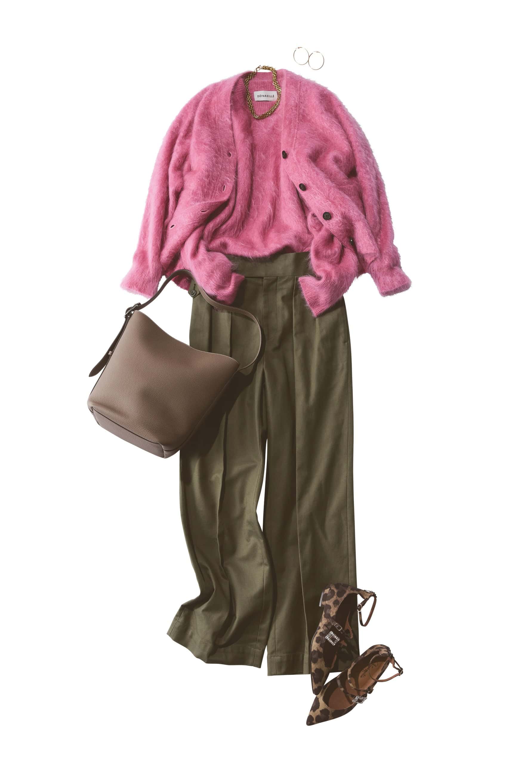 深みカーキのワイドパンツが、華やかなピンクニットをほどよく引き締める好バランス。落ち着いたアースカラーで甘さを抑え、知的で洗練された印象に。ゆったりシルエットと上質素材のコントラストが、余裕漂う大人ムードを演出してくれます。カラーアイテムを品よく着たい日に頼れるパンツスタイル。