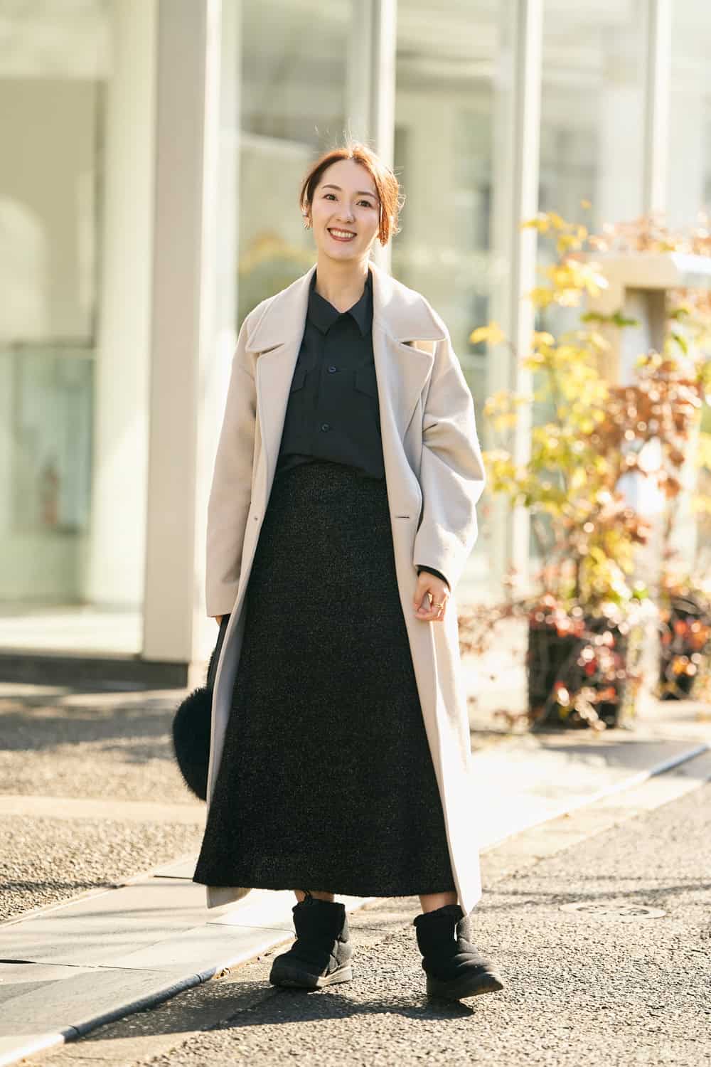 お出かけコーデではあまり出番がなかったスノーブーツですが、モノトーンコーデに取り入れてみると意外としっくり♡ トップスから足元まで縦のラインを意識してオールブラックに。アイテムの素材感を変えることで単調にならないように工夫しました。全体のバランスをAラインに整え、女性らしく優雅な雰囲気を演出しています。