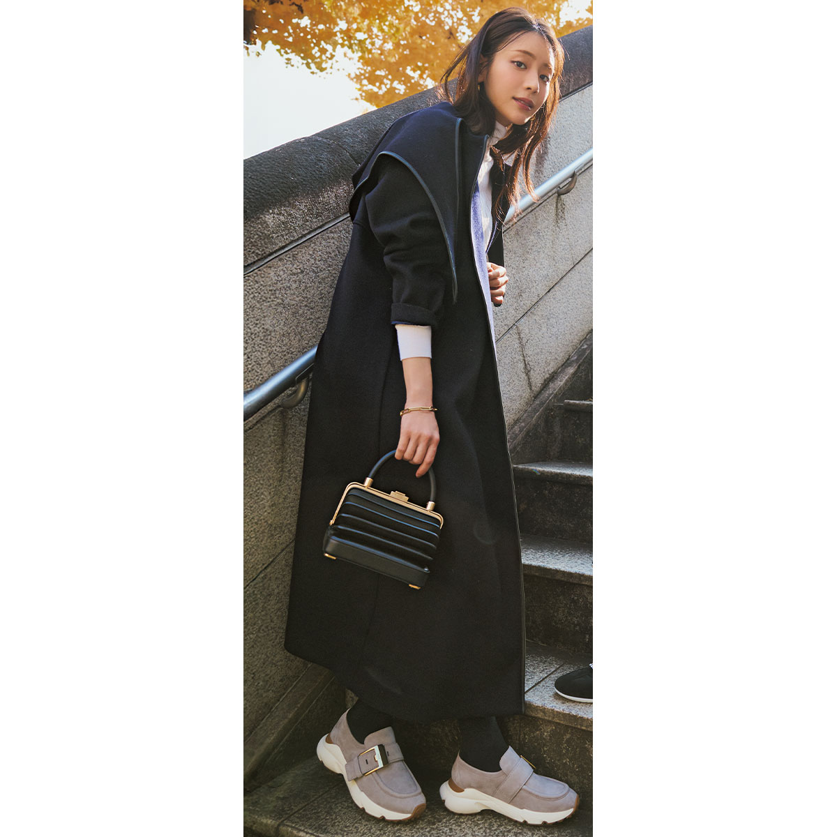 スニーカー¥141,900(トッズ/トッズ・ジャパン)コート¥99,000(サードマガジン)ニット¥34,100(スローン/ザ ショップ スローン 新静岡セノバ店)ピアス¥37,400ブレスレット¥68,200(ともにブランイリス/ブランイリス トーキョー)バッグ¥495,000(ガブリエラ ハースト/ガブリエラ ハースト ジャパン)タイツ¥1,650(靴下屋/タビオ)