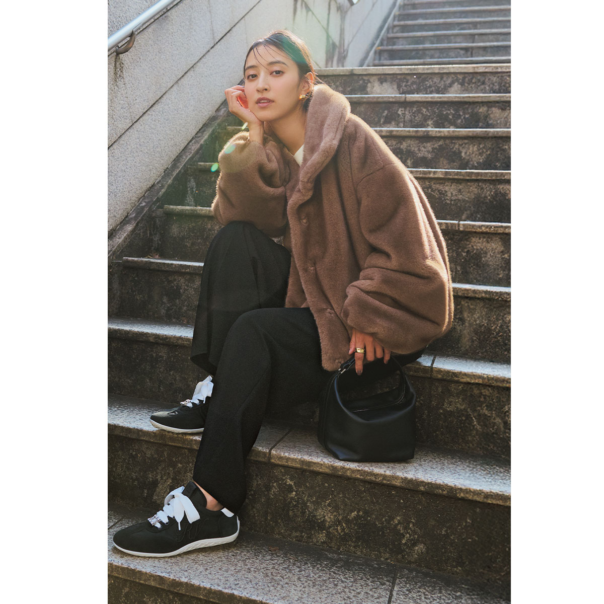 スニーカー¥200,200(ロジェ ヴィヴィエ/ロジェ・ヴィヴィエ・ジャパン)ファーブルゾン¥50,600(ノーブル/ノーブル 有楽町マルイ店)トップス¥30,800(ブロッサム)パンツ¥37,400(セオリー/リンク・セオリー・ジャパン)ピアス¥37,400リング¥46,200(ともにブランイリス/ブランイリス トーキョー)バッグ¥253,000(ヴァレクストラ/ヴァレクストラ ジャパン)