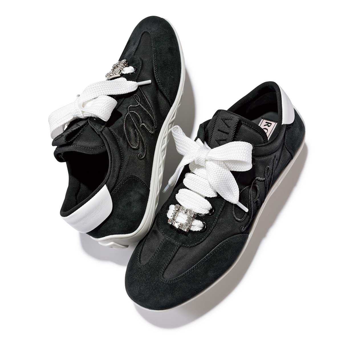 ロープロファイル×太めシューレースに施されたアイコニックなビジューバックルがキャッチー。黒スエード×ナイロンコンビで軽く、1日中フッ軽に過ごせそう。