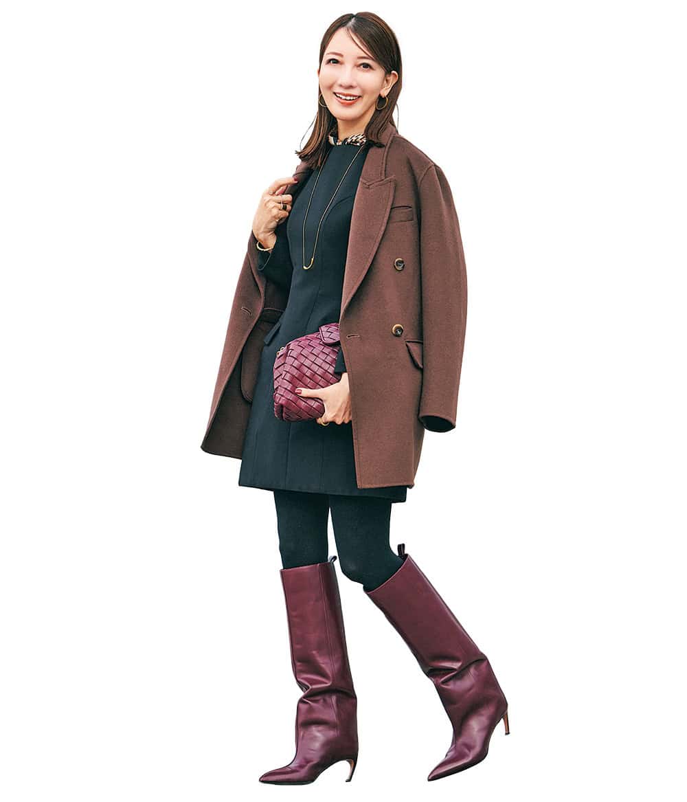 ボッテガのバッグはトレンドすぎず年齢を重ねて愛用できる、投資アイテムとして価値あり!と確信し購入。差し色として活躍しそうなボルドーを選び、オシャレ幅が広がるブラウンコーデにアプデできました。