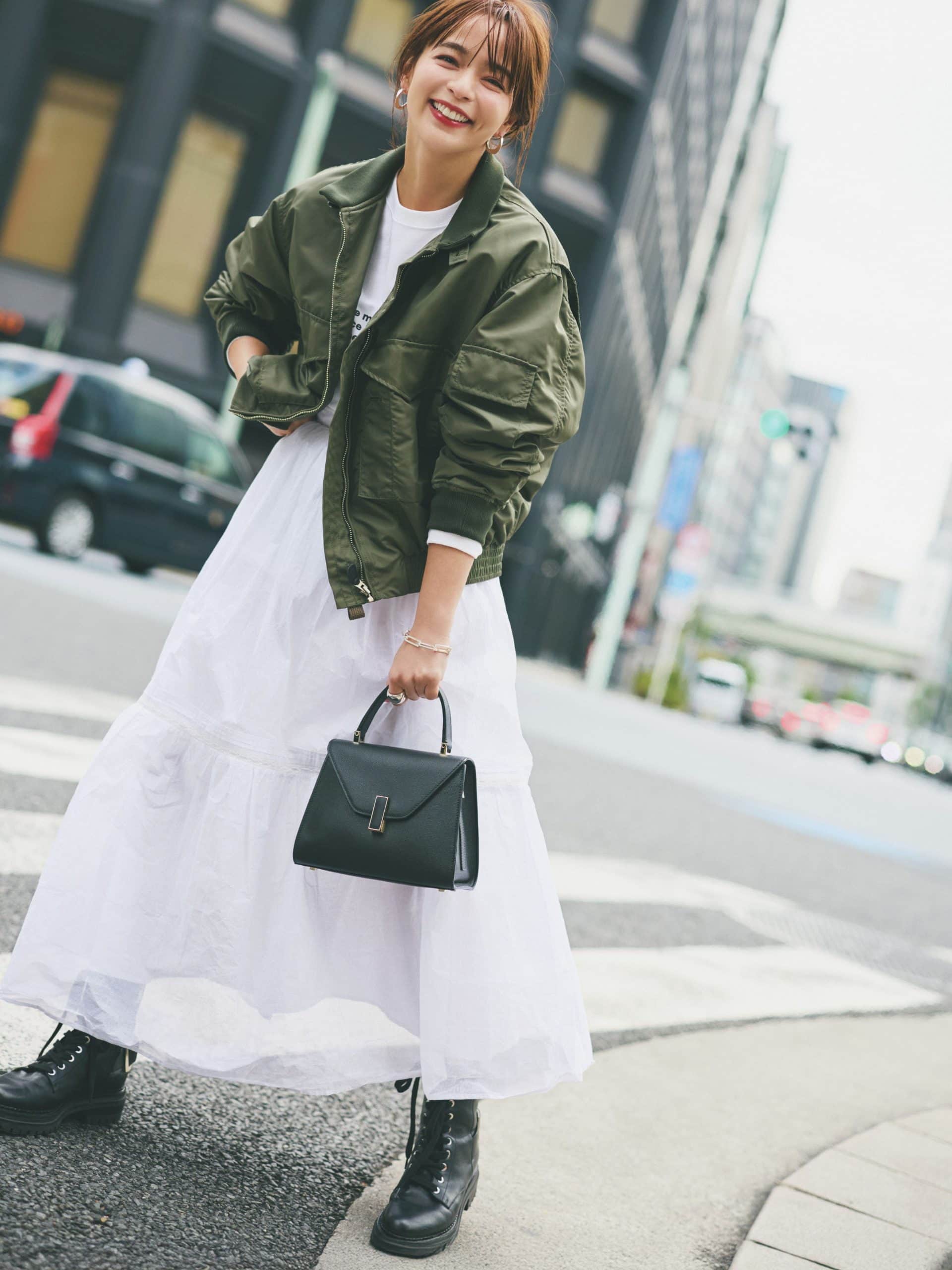 辛口アイテム多めなコーデには、真っ白なフレアスカートをミックス。持ち前の可愛らしさからメンズライクなミリタリージャケットを合わせても女性らしさ満載な仕上がりが完成します!動くたびにふんわりと広がる素材は、華やかさたっぷりです。