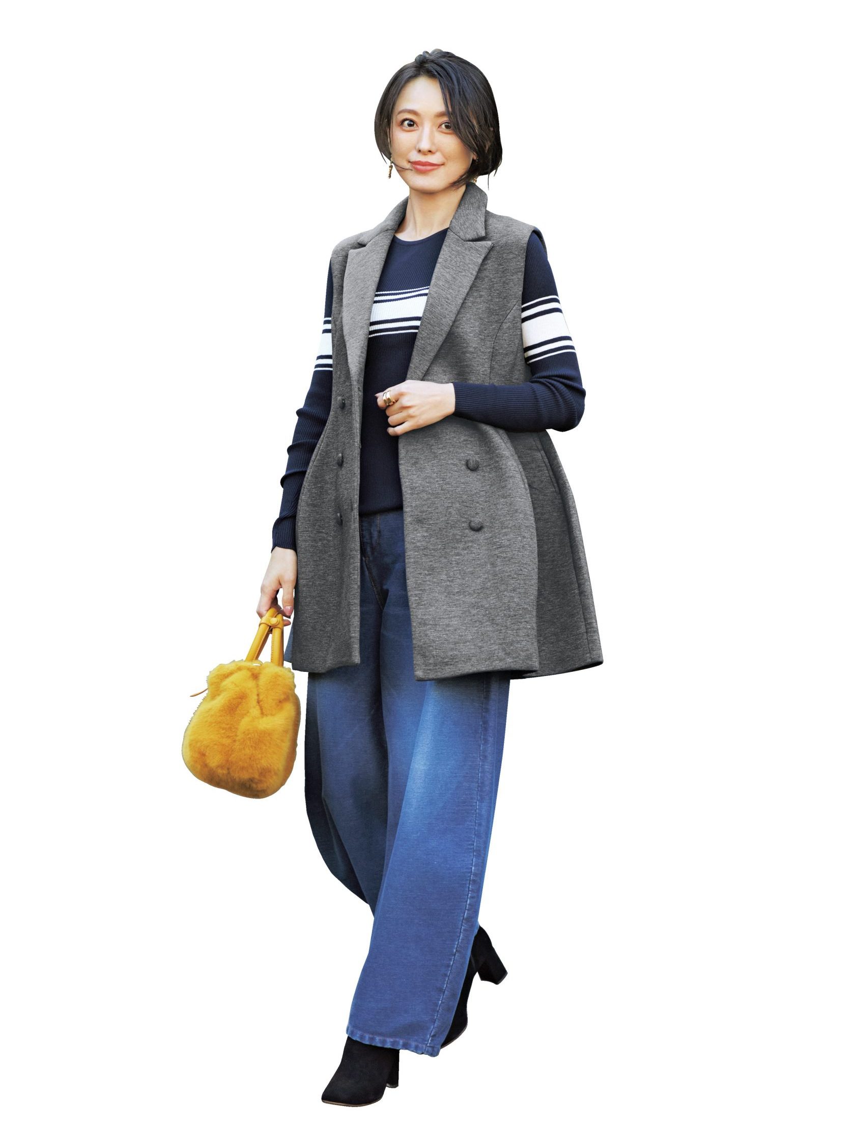 定番ニット×デニムもベストジレで一気に垢抜け
