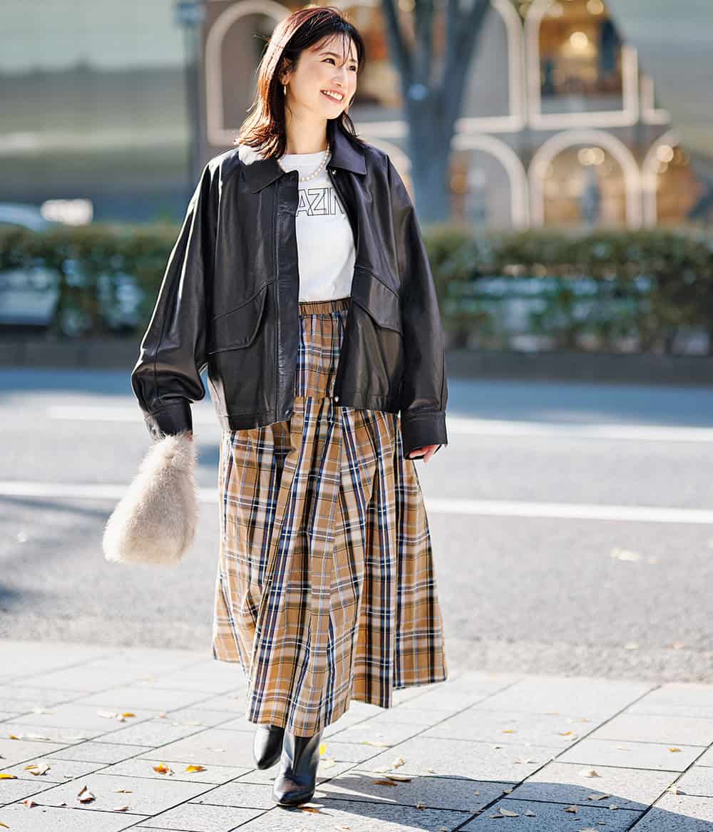スカート¥29,700(アルページュストーリー)フェイクレザーブルゾン¥165,000(ハウス オブ ロータス/ハウス オブ ロータス 二子玉川店)カットソー¥17,600(サードマガジン)バッグ¥17,600(アルアバイル)ブーツ¥94,600(ネブローニ)ピアス¥3,300〈デイジールイス〉ネックレス¥5,500〈TaTa〉(ともにロードス)
