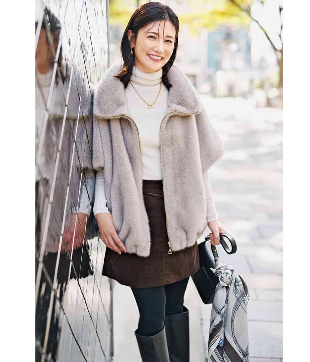 スカート¥13,970(FRAY I.D/FRAY I.D ルミネ新宿2店)ブルゾン¥57,200ニット¥37,400(ともにアナイ)バッグ¥74,800(マエストソ/アルアバイル)ブーツ¥121,000(ネブローニ)スカーフ¥22,000(マニプリ)ピアス¥3,850(ヘンカ/ロードス)ネックレス¥23,650(ココシュニック オンキッチュ/ココシュニック)タイツ¥1,320(靴下屋/タビオ)
