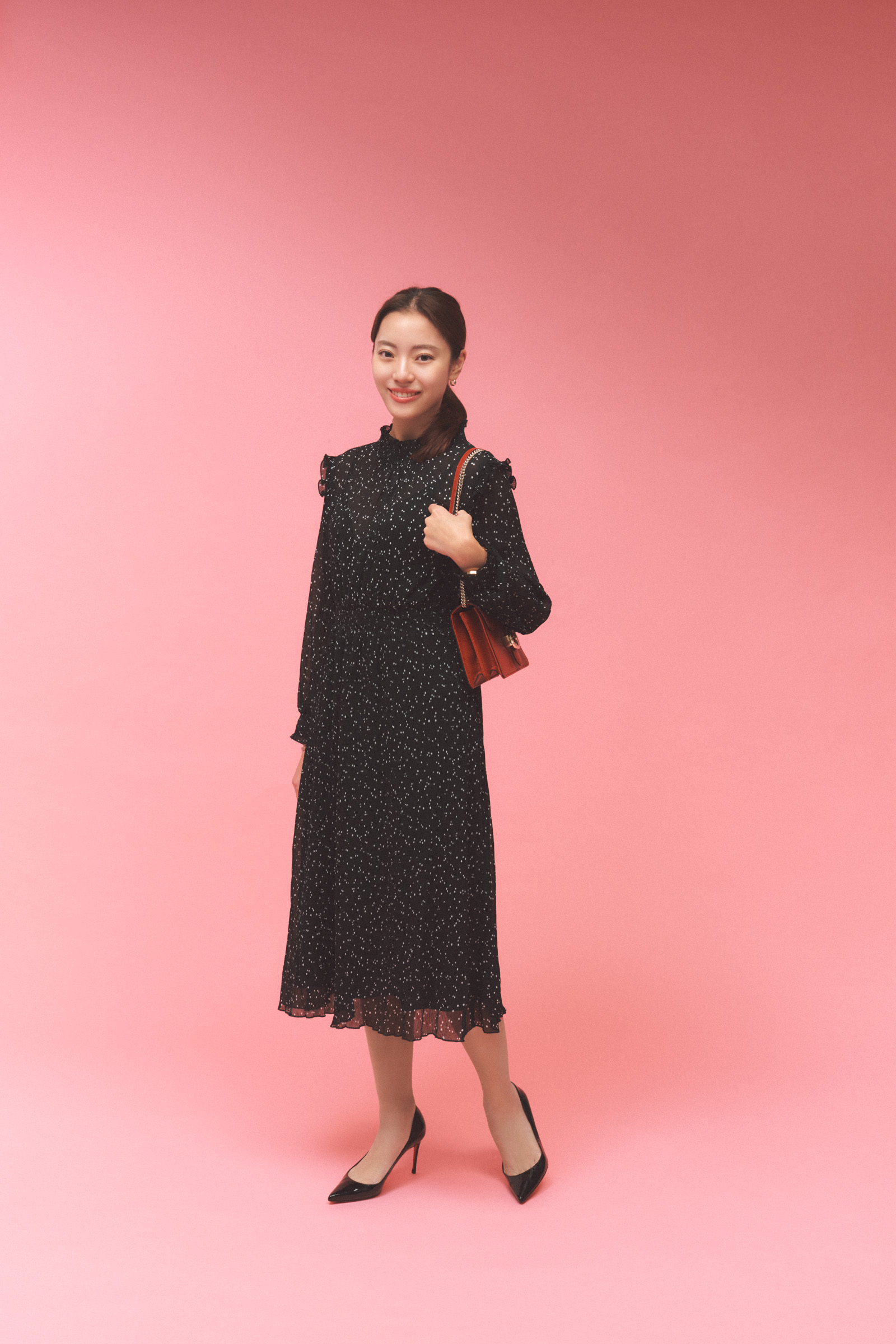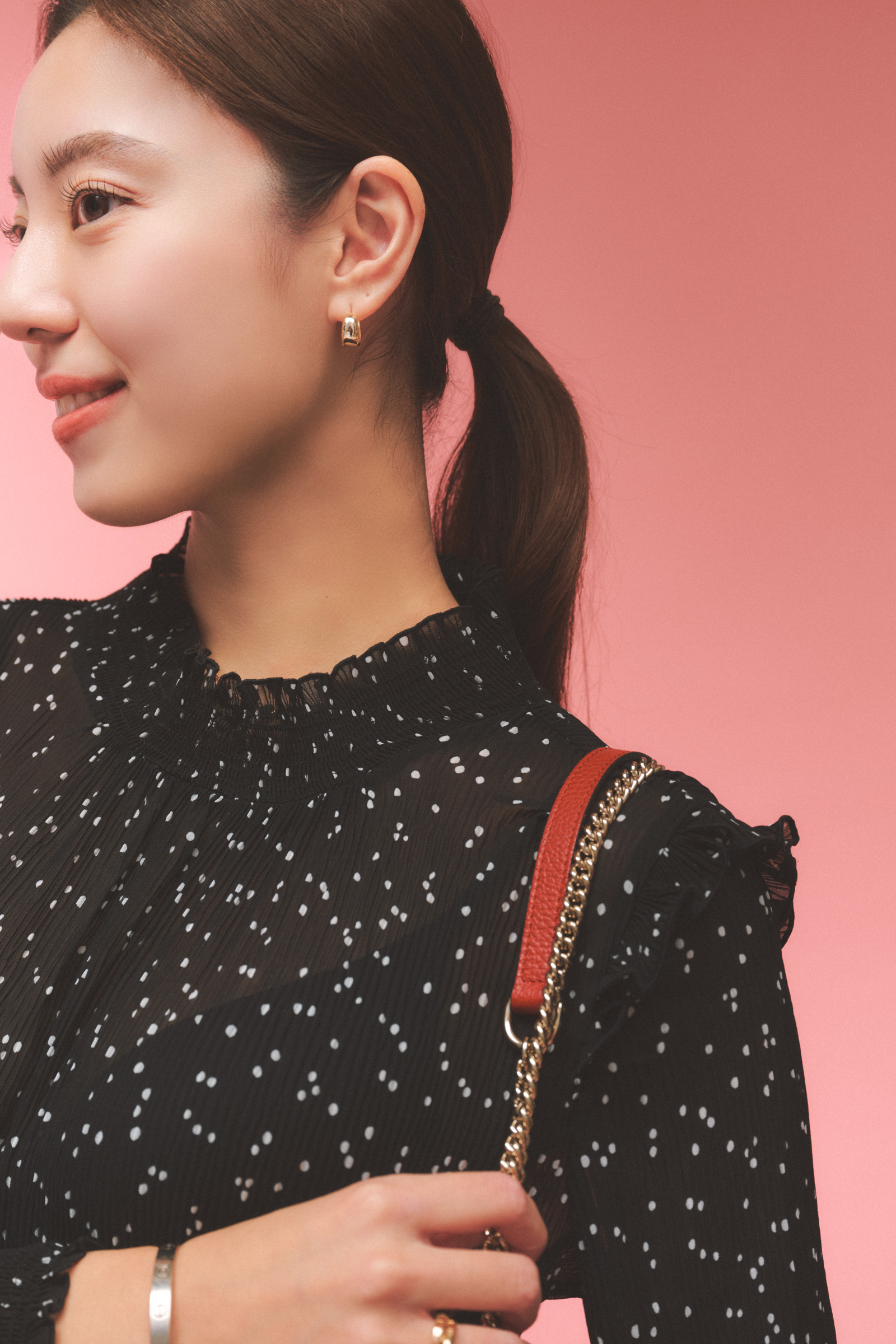 「彼とのディナーの日は、普段より少し背伸びしたオシャレを楽しみたい気分。いつもスポーティなスタイルが多いので、イベントの日は甘めのワンピースにヒールをチョイス。全体が重く見えないよう、グッチの赤バッグを差し色にしました」