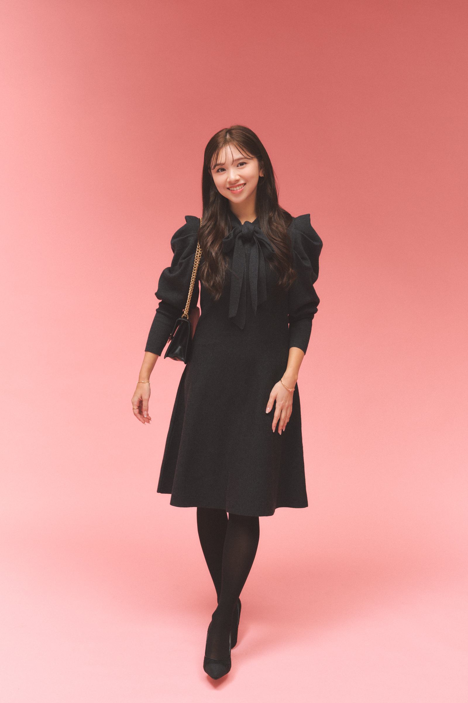 「ショルダーのフリルデザインとリボンのディテールが顔周りを華やかに見せてくれるところが購入の決め手でした。ワンピースは無難になりがちですが、顔周りにデザインがあると写真映えもしやすいです。黒ではなくグレーを選ぶことでこなれ感が出て、品よく着られるのもポイント。ジャケットを羽織れば仕事にも使えるので、幅広いシーンで活躍してくれています」