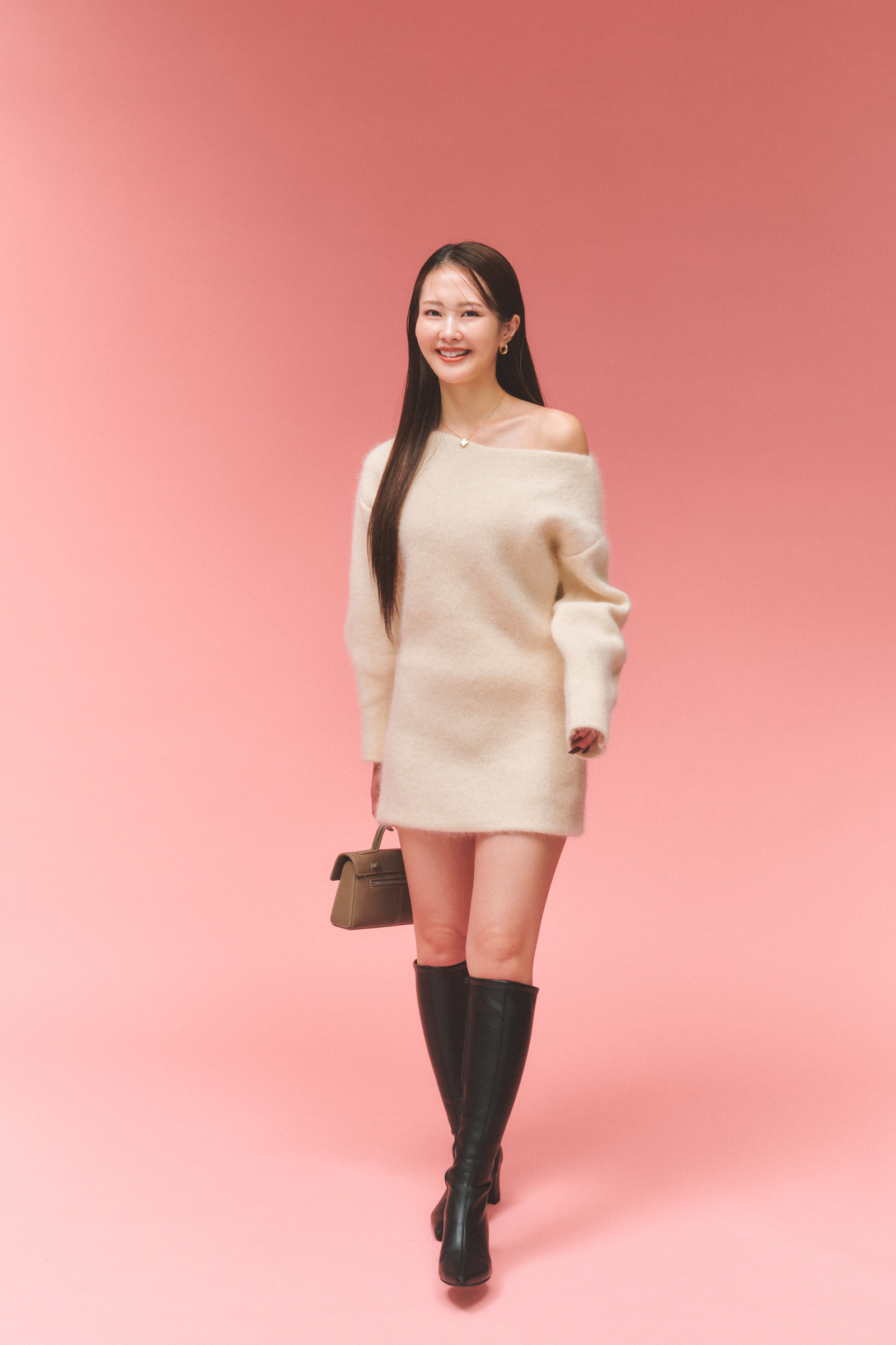 「ザ トゥーのニットワンピースを主役に、足元はロングブーツを合わせました。足元がしっかりカバーできるので、防寒もばっちり。甘くなりすぎないよう、ヘアはダウンスタイルで大人っぽくまとめました」