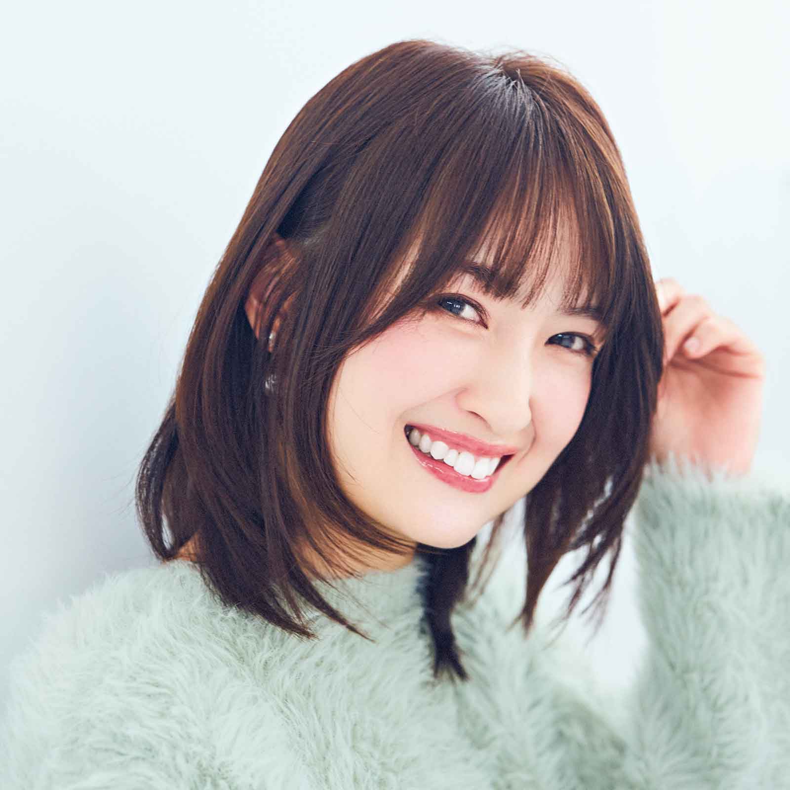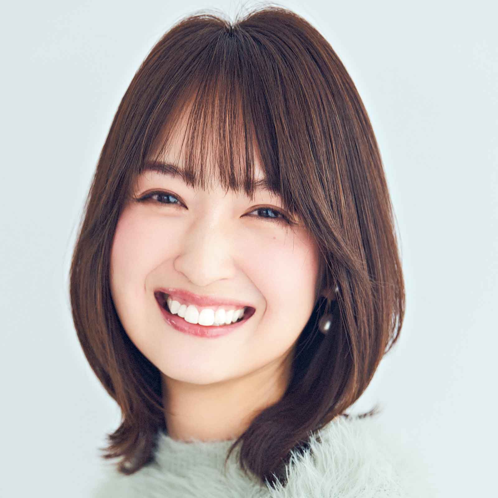 伸びかけミディアムが、バランスよくフェイスレイヤーを入れたスタイルに。耳前から幅広気味にレイヤーを入れ顔周りに軽さと動きを出すことで小顔見え。32mmのコテで毛先を軽く外ハネさせたカジュアルスタイリングも垢抜けます。