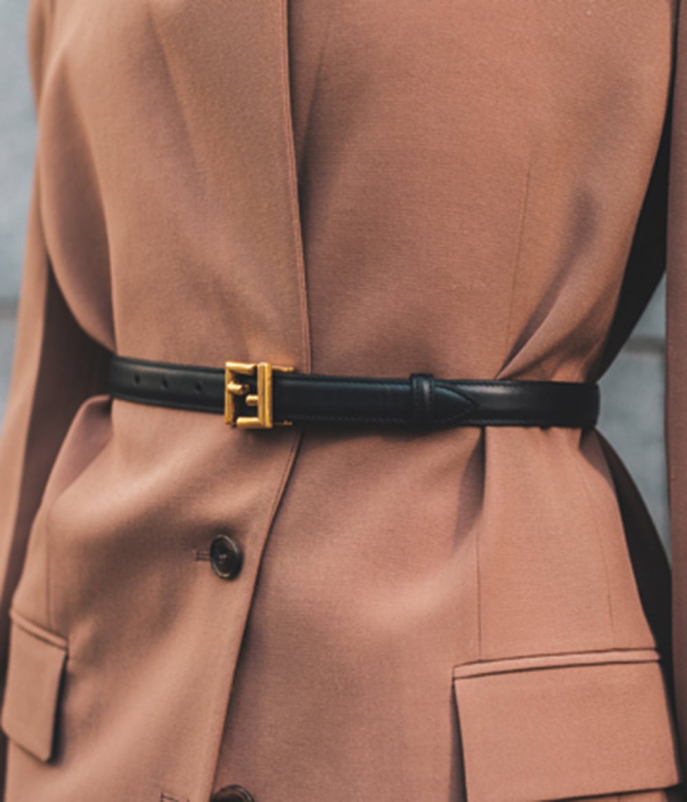 「RECTOのジャケットはECで購入。流行でもある肩幅広めのマニッシュなデザインは、ウエストマークすることで華奢な体型にも馴染みます」(大川内朋美さん 38歳・フリーモデル、PR)