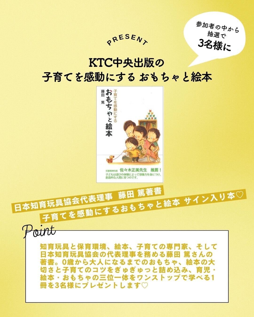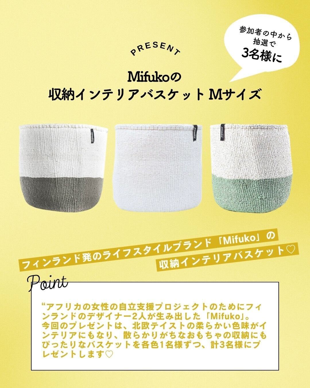 今回参加していただいた方の中から抽選で、豪華プレゼントが当たるチャンスも。Mifukoの収納インテリアバスケット(1点)と、藤田篤 著「子育てを感動にする おもちゃと絵本」をセットにして3名様にプレゼントいたします。ぜひこの機会をお見逃しなく♡