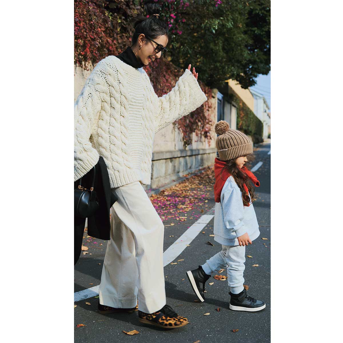 【ママ】レオパードスニーカー¥10,990(ZARA)ケーブルニット¥53,900(HER.)タートルニット¥39,600(ウメダ/ウメダニット)パンツ¥29,700(イエナ ラ ブークル/イエナ ラ ブークル ニュウマン新宿店)メガネ¥49,500(モスコット/モスコット アオヤマ)ピアス¥39,600(ブランイリス/ブランイリス トーキョー)ストール¥24,200(ブロッサム)バッグ¥462,000(ガブリエラ ハースト/ガブリエラ ハースト ジャパン)【キッズ】トップス¥3,300肩がけしたトップス¥3,300パンツ¥2,750(すべてケチャップ/ケチャップ PR)その他/スタイリスト私物