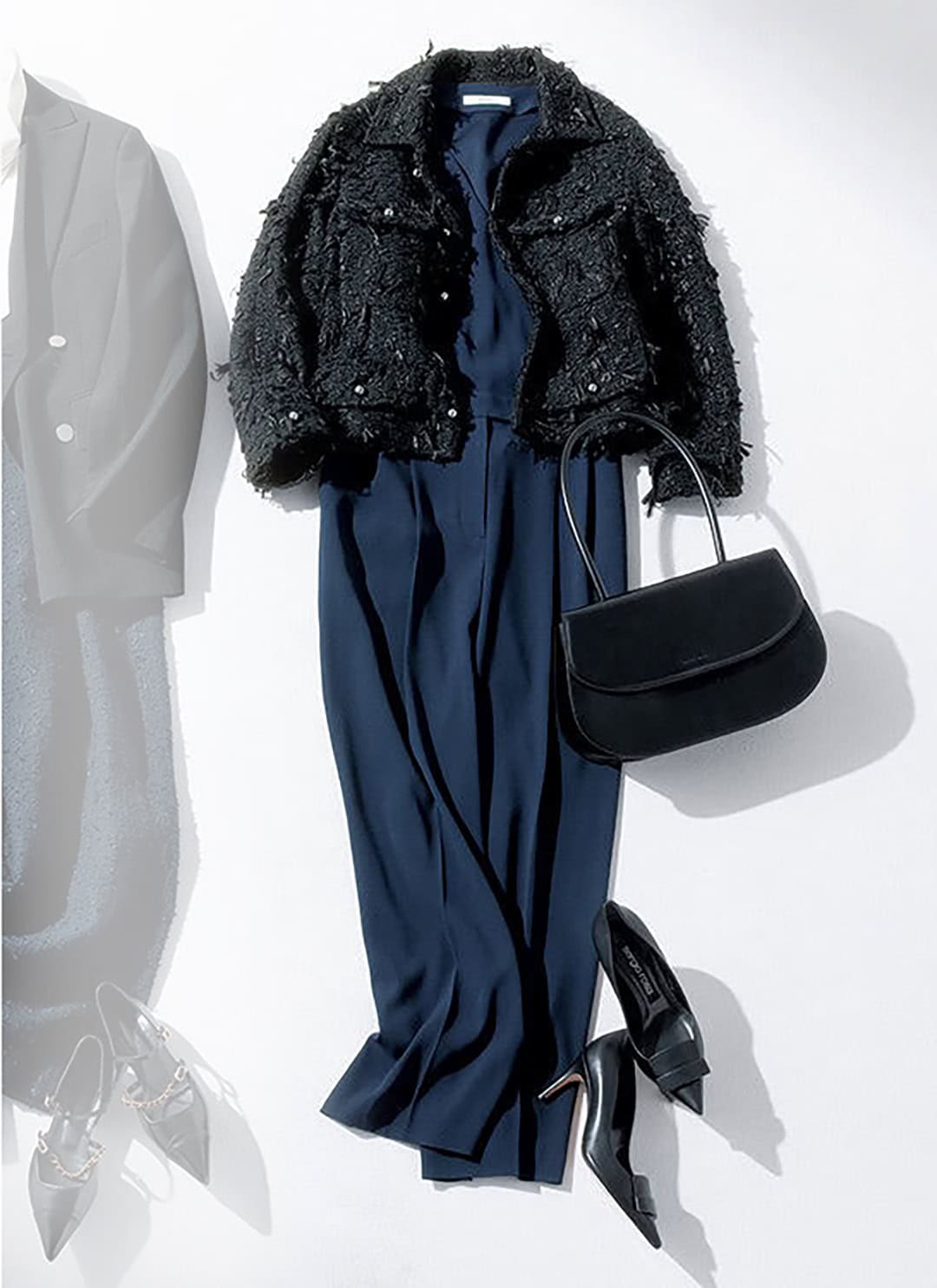 ヴァジックの中でも、よりラグジュアリーな素材があしらわえた「メゾン ヴァジック」の名品。ほどよくコロンとしたフォルムが可愛らしく、上品。フォーマルにも、モードにも似合います。瞬時に映える上質なツイードジャケットはIラインを強調できるシンプルなオールインワンで引き算コーデをすると洗練見え。バランスの取りやすいジャケットの丈感も安心。ツイードジャケット¥242,000(マディソンブルー)オールインワン¥55,000(ANAYI)シューズ¥130,900(セルジオ ロッシ/セルジオ ロッシ ジャパン カスタマーサービス)