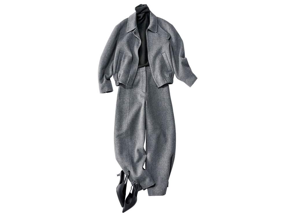 「クロップド丈のジャケットは纏うだけでモードな印象を演出し、脚長効果も発揮。肩の程よい幅感もポイントです。パンツは裾のベルトでシルエットが変えられるのも魅力。167cmの私には絞った方がバランスが取りやすい」と赤枝さん。