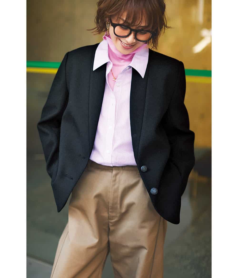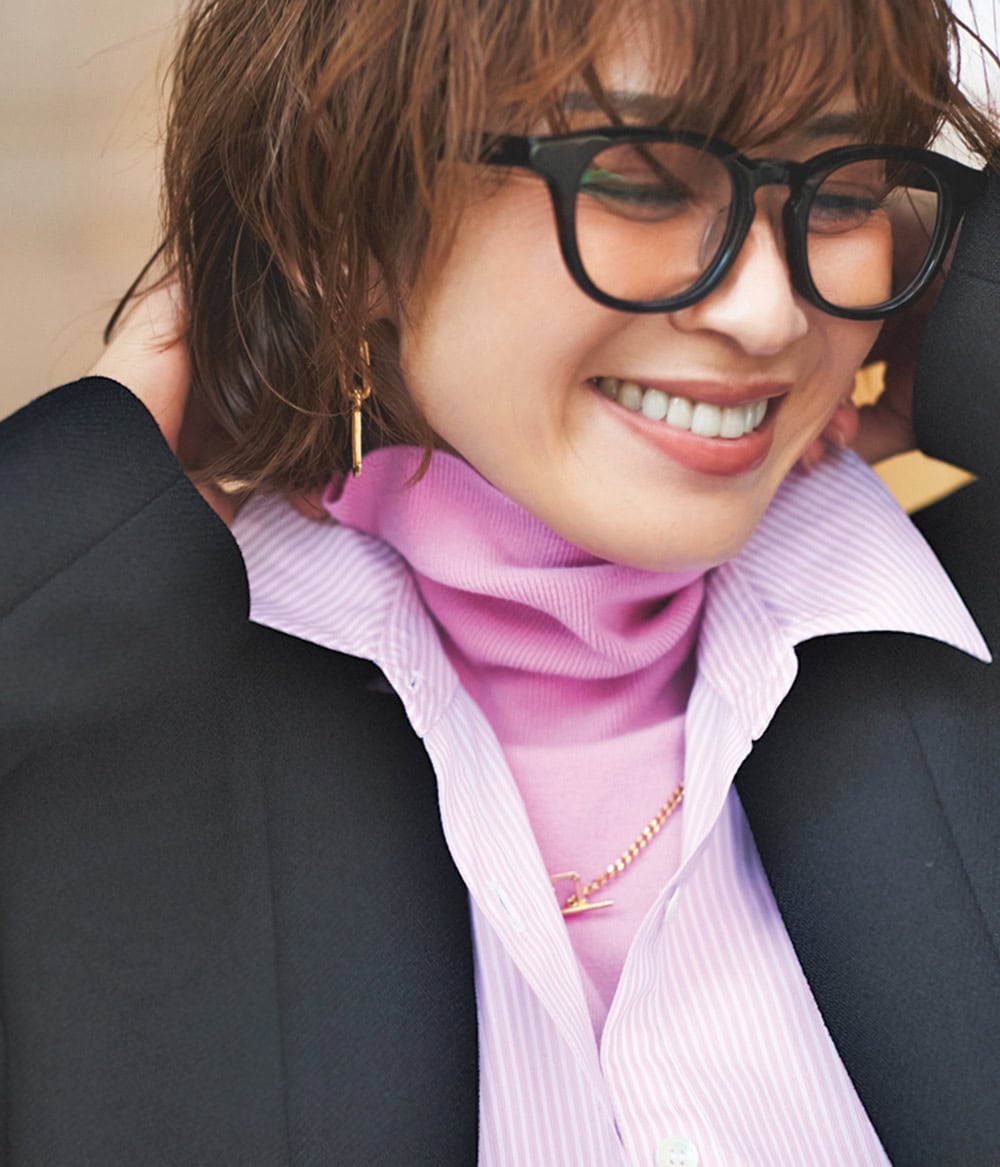 ジャケット¥50,600(カデュネ)シャツ¥17,600(アプワイザー・リッシェ)ニット¥49,500(デパリエ/デパリエ 伊勢丹新宿店)パンツ¥31,900(ハイク/ボウルズ)バッグ¥561,000バッグチャーム¥111,100(ともにヴァレクストラ/ヴァレクストラ ジャパン)パンプス¥31,900(プランクプロジェクト/プランクプロジェクト 青山店)ピアス¥39,600(ブランイリス/ブランイリス トーキョー)メガネ¥40,700(プロポ/プロポデザイン)ネックレス¥23,650(ココシュニック オンキッチュ/ココシュニック)