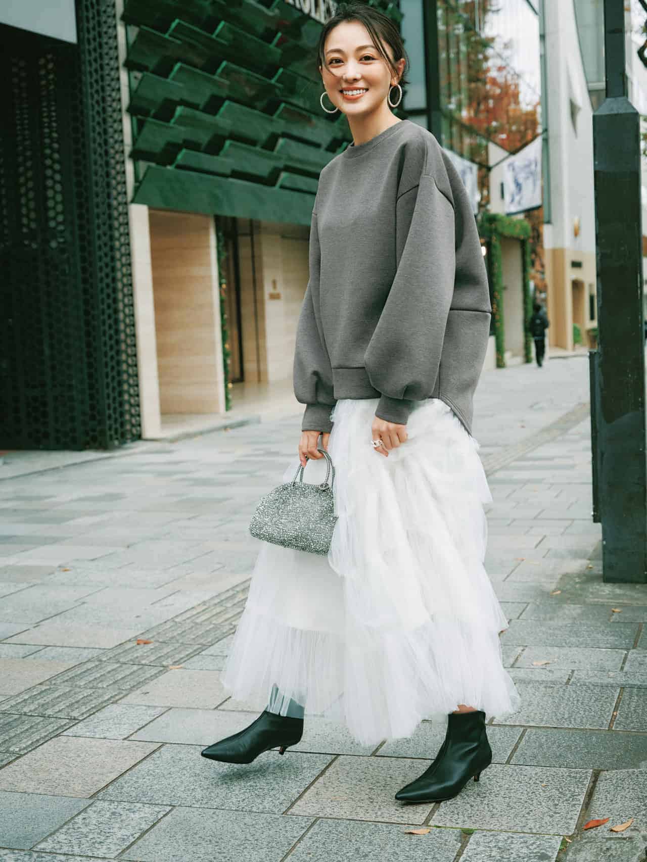 スニーカー¥141,900(トッズ/トッズ・ジャパン)コート¥99,000(サードマガジン)ニット¥34,100(スローン/ザ ショップ スローン 新静岡セノバ店)ピアス¥37,400ブレスレット¥68,200(ともにブランイリス/ブランイリス トーキョー)バッグ¥495,000(ガブリエラ ハースト/ガブリエラ ハースト ジャパン)タイツ¥1,650(靴下屋/タビオ)