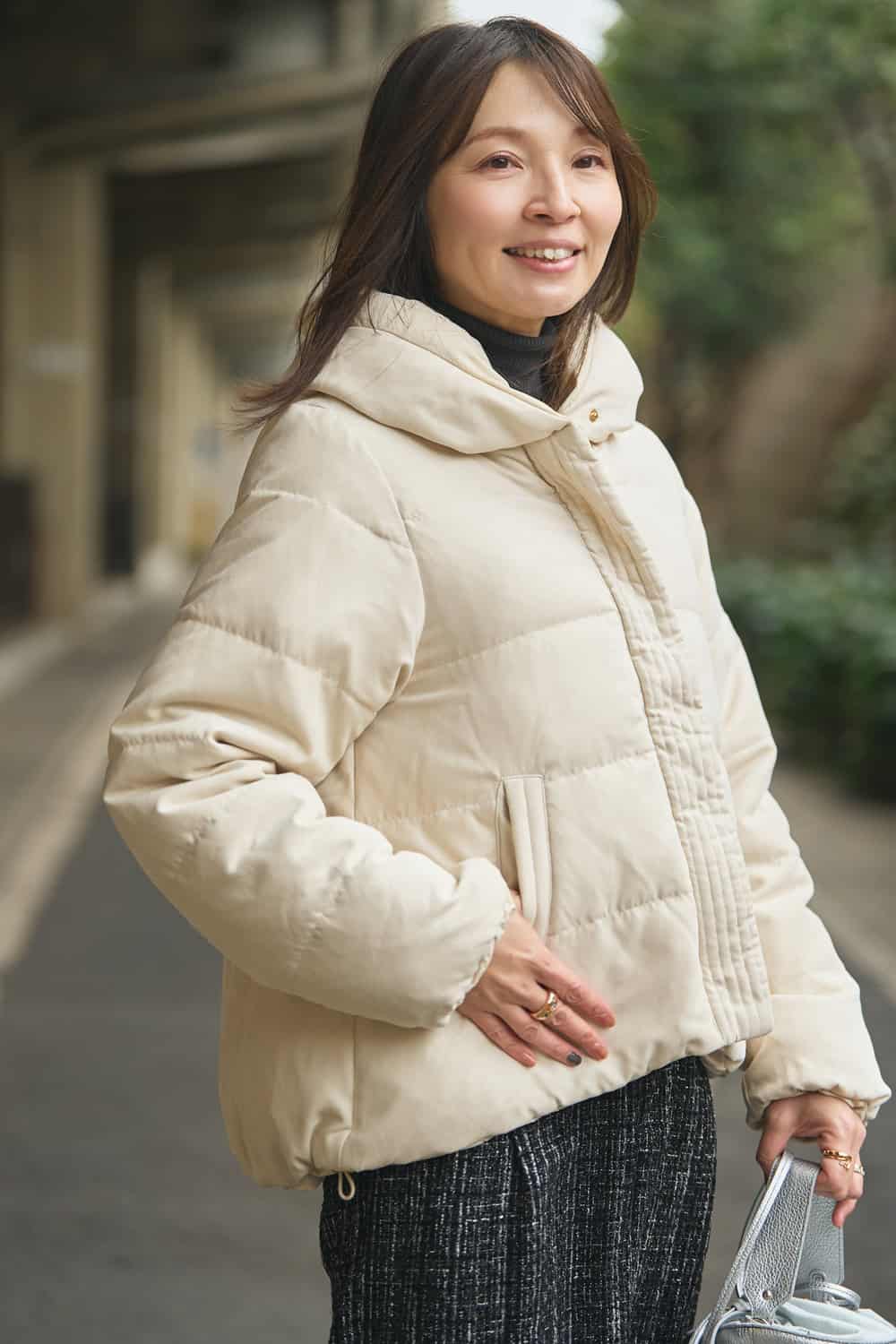 「珍しいコーデュロイ素材のダウンはカジュアルからキレイめまでシーンを問わず使え、あたたかさを感じる素材感に惹かれました。白は汚れが気になるものの、挑戦しやすい価格帯だったのも決め手の1つ。着回しが利くダウンの下は、ビジネスシーンに着て行きたいツイードのオールインワンで品とこなれ感をプラスしました。オンオフ問わず、活躍する1着です」