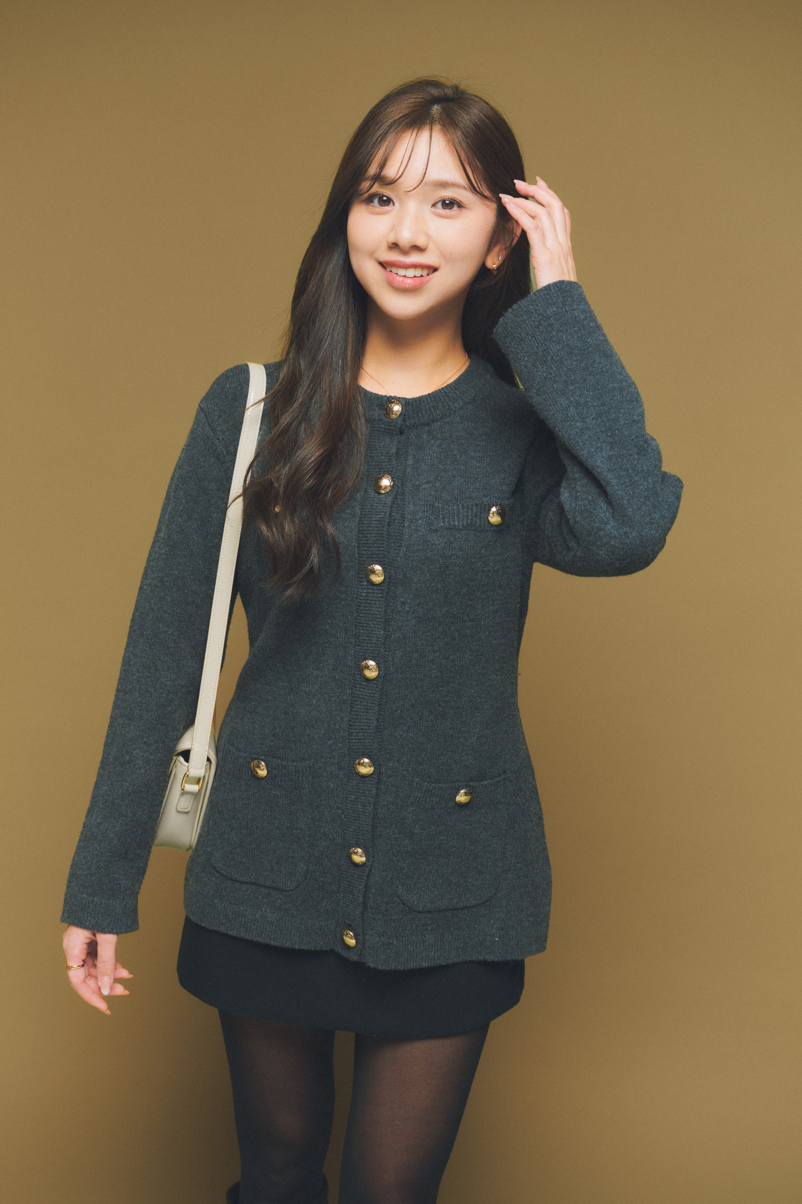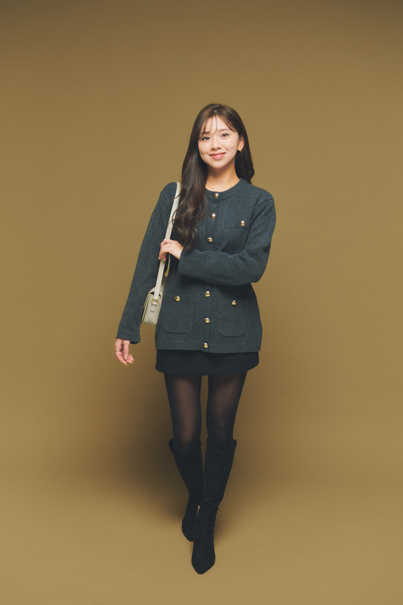「冬は色や素材が重くなりがちなので、ミニ丈で軽やかさを意識しました。H&Mのカーディガンは腰くらいの丈感でワンピ感覚でも使えて、ミニ丈と合わせると今年っぽいバランスになります。キレイめのコートでもカジュアルなダウンでも合わせやすく、友達との休日ランチの鉄板コーデです」