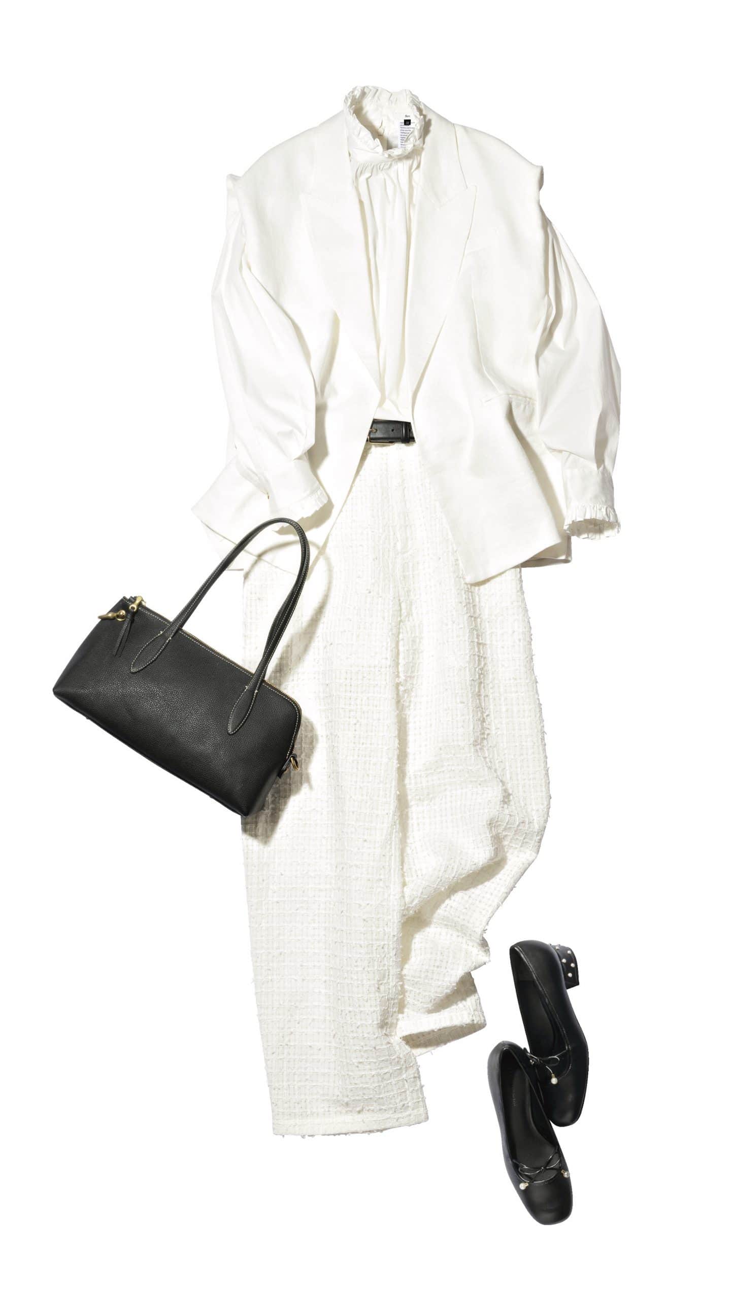 ジレ¥50,600(ルームエイト ブラック/オットデザイン)フリルブラウス¥37,400ツイードパンツ[2月発売予定]¥46,200(ともにソブ/フィルム)バッグ¥47,300(トフ&ロードストーン)パールパンプス¥9,900(チャールズ&キース/チャールズ&キース ジャパン)ベルト¥17,600(ebure/リトルリーグ インク)