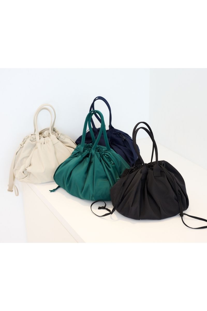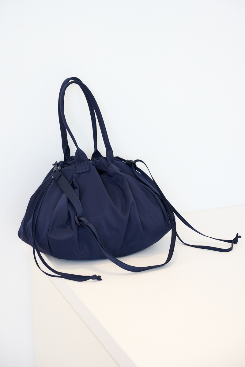 ドロストをギュッと絞って、ミニバッグ風に。落ち着いたネイビーの色合いは、デニムジャケットやスウェットなどどんなアイテムにも似合います。