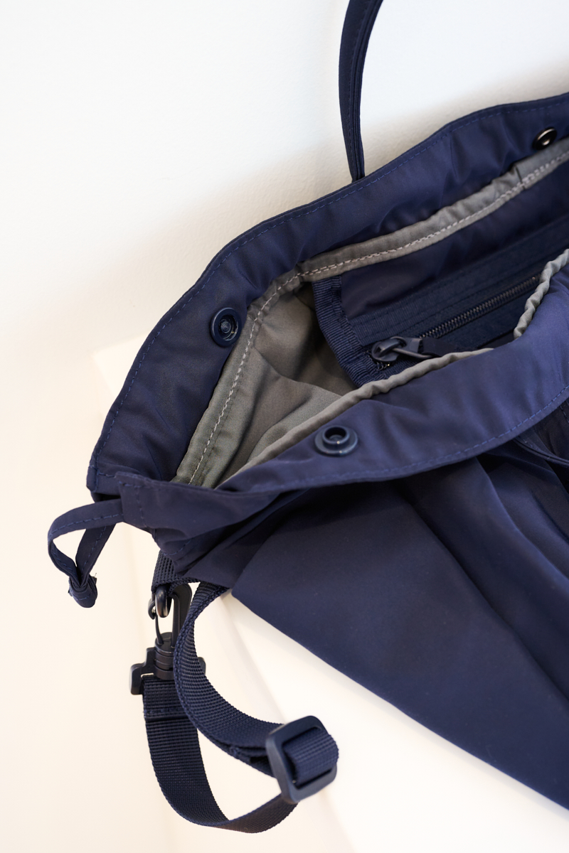 ドロストを緩めれば大容量のトートに。その際も、中央のボタンで口を閉じられます。