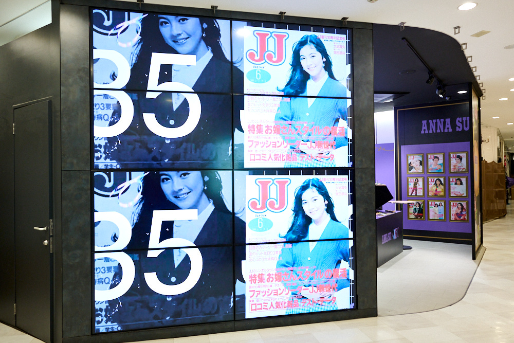 渋谷の地下通路から繋がった「SHIBUA109渋谷店」の地下1階にあるDISP!!!が会場です。入口の扉を開けると、いきなりJJの歴史を振り返る華やかなサイネージが出迎えてくれます。