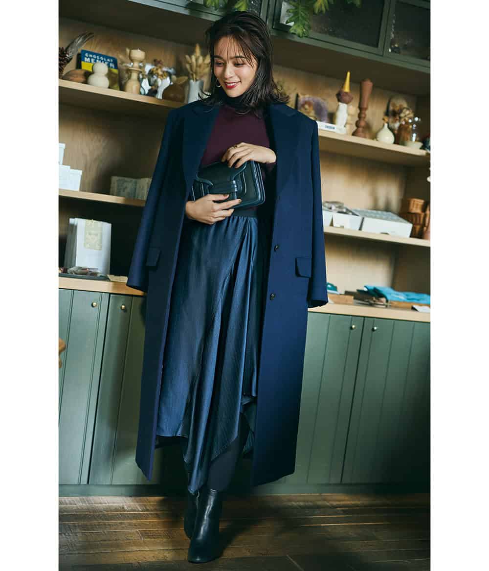 シルエット美が際立つ、大胆なアシメトリー。ハイゲージニット×ロングチェスターコートで知的な印象はキープ。じわじわ華やぎつつ、一目置かれる存在に。