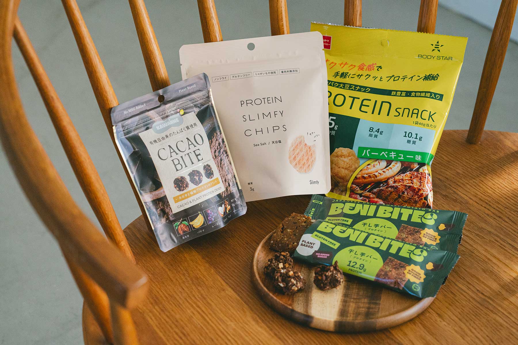 [上右]濃厚な味とサクサクした食感で、たんぱく質が15g摂取できる! BODY STAR サクサク食感 プロテインスナック〈バーベキュー味〉[オープン価格](おやつカンパニー)※現在は販売終了。「BODY STAR クリスピー食感 プロテインスナック〈サワークリームオニオン味╱カレー味〉」をリニューアル新発売。[上中]4種のプロテインをノンフライ製法でスナックに。グルテンフリーで、たんぱく質は20g。低脂質、低糖質。天然塩100%使用。プロテインスリムファイチップス 天日塩味 30g[オープン価格](スリムファイフードテクノロジー)[上左]有機豆由来プロテインとリッチカカオ、ナッツの一口サイズのクランチ。KAWAÌINE CACAO BITE カカオと植物プロテインのクランチ¥298(Biople)[右下]国産の「紅はるか」による干し芋を独自製法で甘みと栄養をバーに凝縮。1本でピープロテインを12.9g摂取。プラントベースでグルテンフリーBENI BITES 干し芋バー プロテイン 52g各¥410(BENI BITES)