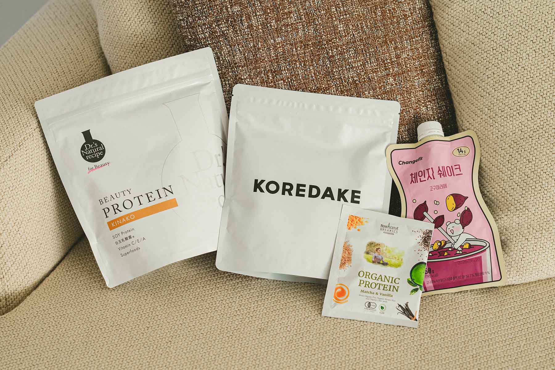 [右から]手軽なパウチ型のシェイク。たんぱく質18gを摂取できます。歯応えのあるオートボール&グラノーラ入り。チェンジフィット サツマイモラテ味¥540(エイチ・ジェイ・インターナショナル)有機発芽玄米たんぱくをはじめ、3種の植物性プロテインによるたんぱく質12g入り。チアシードが満腹感をサポート! NOVA ORGANICS オーガニックプロテイン抹茶&バニラ 21g¥486(Biople)女性が1食に必要な33種類の栄養素が入った完全栄養プロテイン。アミノ酸スコア100! KOREDAKE ウェルネスプロテイン ミルクティー 700g¥5,760(メップル)100%ソイの無添加プロテイン。白玉乳酸菌で腸活をサポート。ドクターズ ナチュラル レシピ 美容プロテイン きなこ味 350g¥3,780(アンファー)
