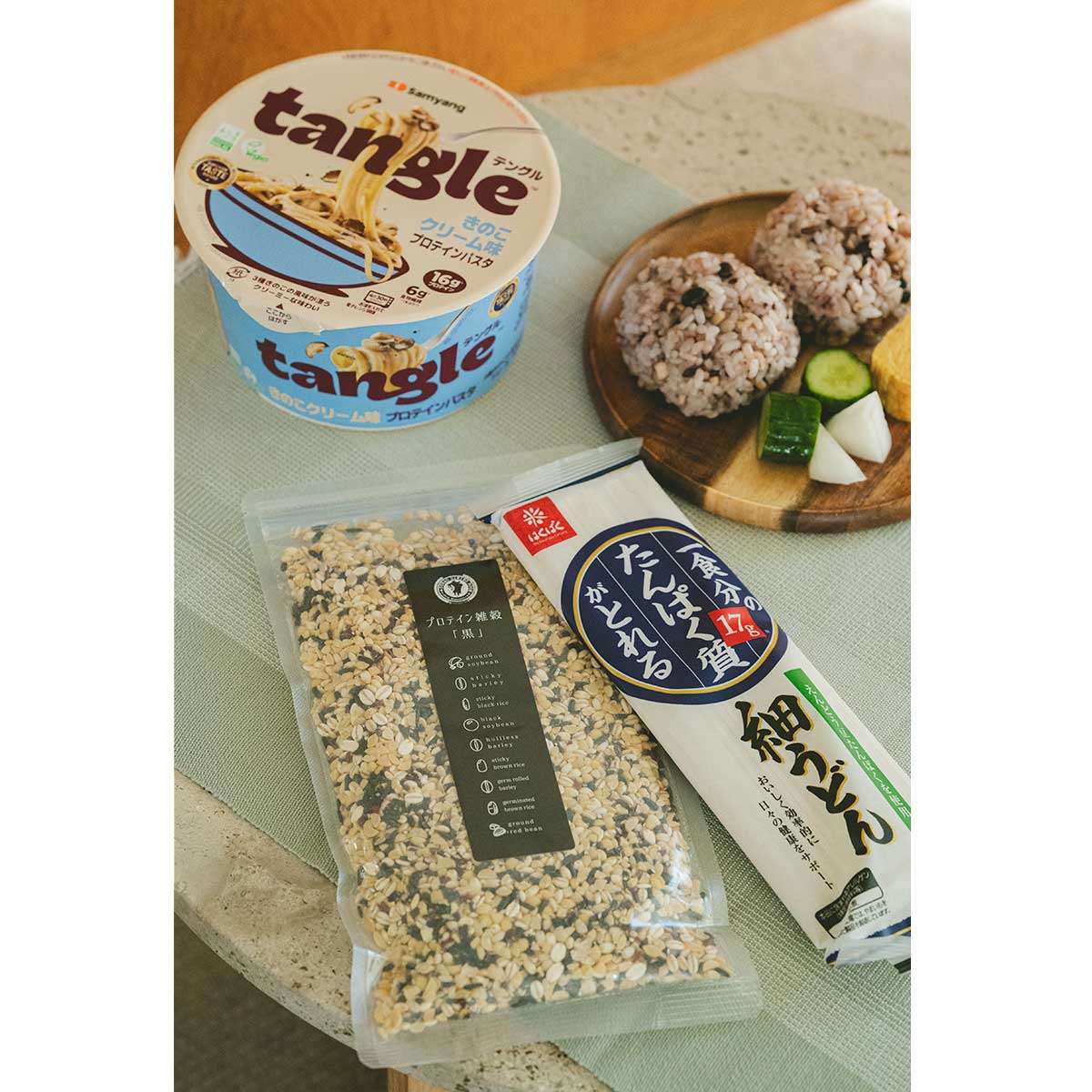 [上]ひよこ豆から作られたプロテイン麺。1食16gのたんぱく質を摂取できます。トリュフなど3種のきのこクリームソース。テングル きのこクリーム味 プロテインパスタ 105g[オープン価格](三養ジャパン)[右下]1食につきたんぱく質を約17g摂取可能。えんどう豆たんぱく入りで、もっちりとした食感。一食分のたんぱく質がとれる細うどん 180g¥340(はくばく)[左下]国産雑穀が9種類イン。混ぜて炊くことでお茶碗1杯150gにつき約6gのたんぱく質が補えます。プロテイン雑穀 黒 300g¥1,448(すなお食堂)