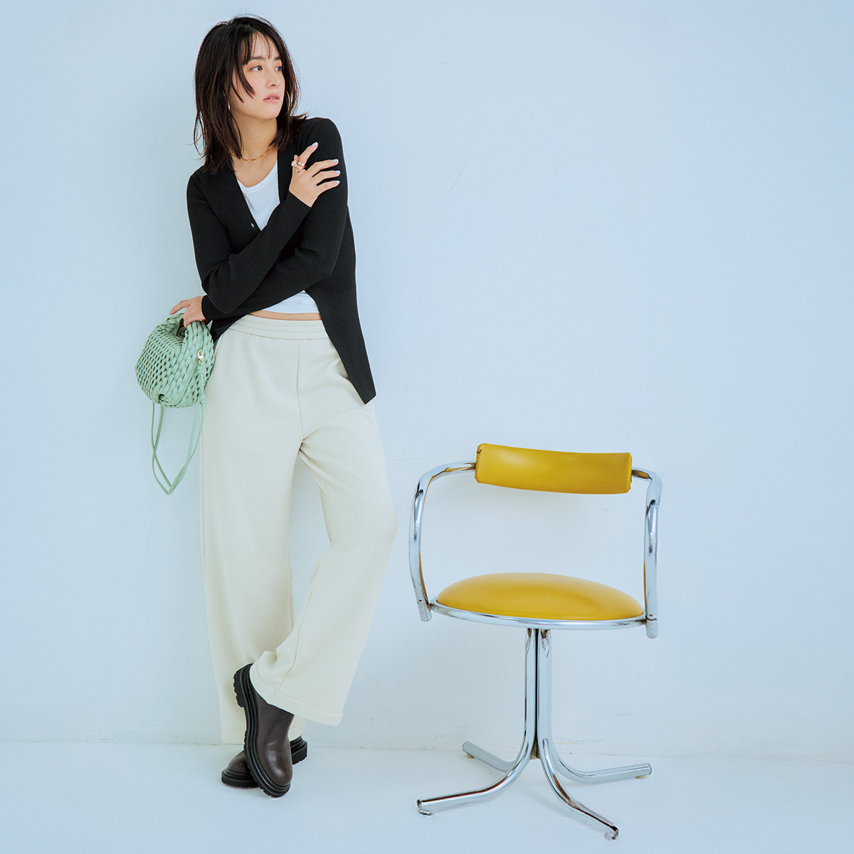 スウェットパンツは、白を選ぶことでキレイめ寄りにシフト。タイトめなリブカーデでラインを整え、ウエストまわりに抜けをつくれば、ラフさもほどよくセーブされます。足元はブーツで引き締めて、力を抜きつつもきちんと見えるポイントを押さえて。
