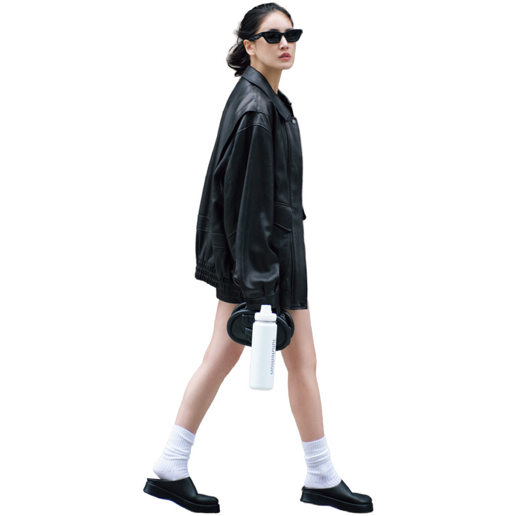 レザーアウター×ショートパンツのオールブラックは、分量で差をつけるのがポイント。上は重さのある素材でまとめつつ、ボトムスは脚を出して軽さをつくることで、黒一色でもバランスよくまとまります。足元はソックス×フラットシューズでスポーティに外し、モード感をほどよくカジュアルダウン。