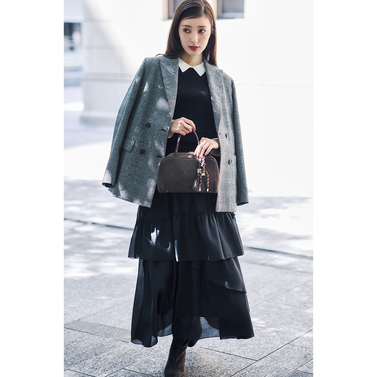 お呼ばれシーンでのモノトーンはまわりとかぶりやすく、どうしても似た印象になりがち。動きのあるティアードスカートにチェック柄のジャケットを重ねれば、クラシカルさとハンサムさをほどよく両立できます。甘さを抑えつつも堅くなりすぎず、まわりと一歩差がつく装いが完成。