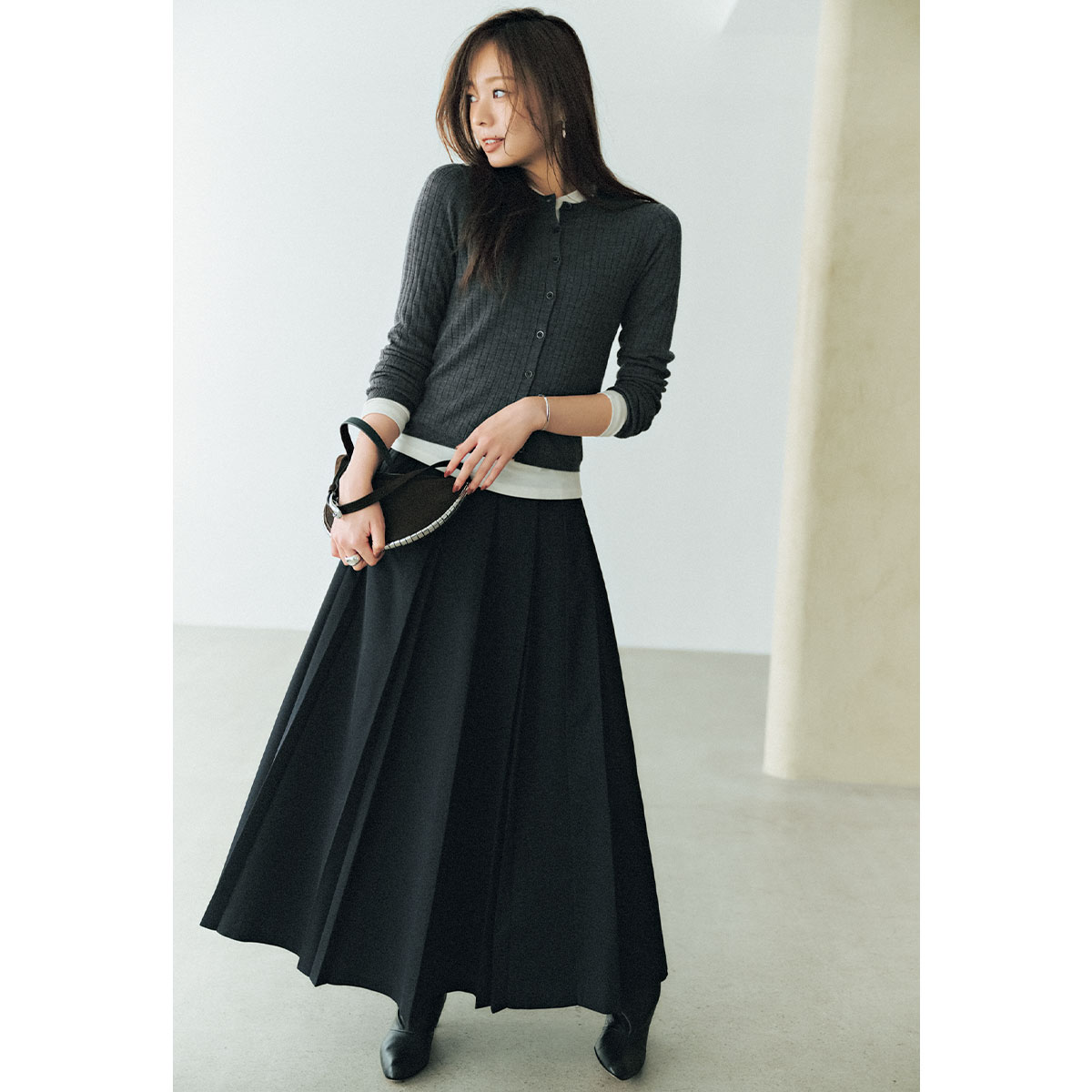 細身のリブカーディガンに、分量のある黒スカートを合わせてシルエットにコントラストを。コンパクトなトップスが上半身をすっきり見せ、自然とスタイルアップが叶います。インに薄手のロンTを重ね、首元・袖・裾から白をのぞかせることで、モノトーンに奥行きをプラス。