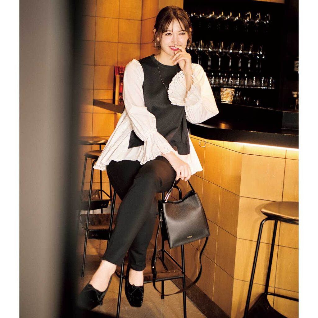 トップスは、まるでレイヤードしているようなデザインがポイント。フリルやボリューム袖など甘さのある要素も、白×黒の配色ならかわいく転びすぎず、ほどよく落ち着いた印象にまとまります。ボトムスは細身の黒パンツを合わせて、全体をすっきりと。