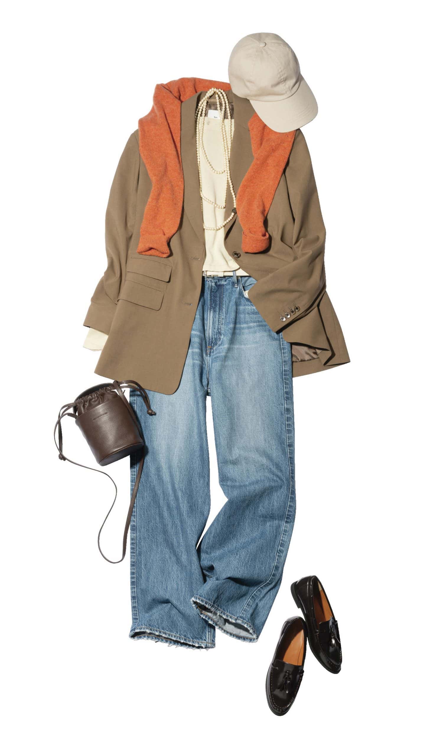 ジャケット¥75,900〈ソブ〉ネックレス¥30,800〈ダブルスタンダードクロージング〉(ともにフィルム)ニット¥18,700(マイカアンドディール/DMC)オレンジニット¥24,000ベルト¥12,000(ともにバナナ・リパブリック)パンツ¥27,500キャップ¥6,600(ともにアッパーハイツ/ゲストリスト)バッグ¥44,000(ザハイライツ)ローファー¥9,900(オゥ バニスター/アバハウスインターナショナル オンラインストア)