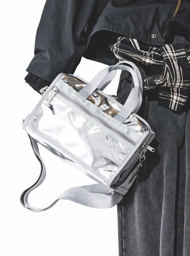 機能性重視の地味色コーデをピカピカなシルバーが華やぎます。色味やボストン型のデザインでカチッと見せつつ、ベルト紐で抜け感を作ってバランスを取るのがポイントです。仕分けできる外ポケット付きで収納力まで頼れます。
