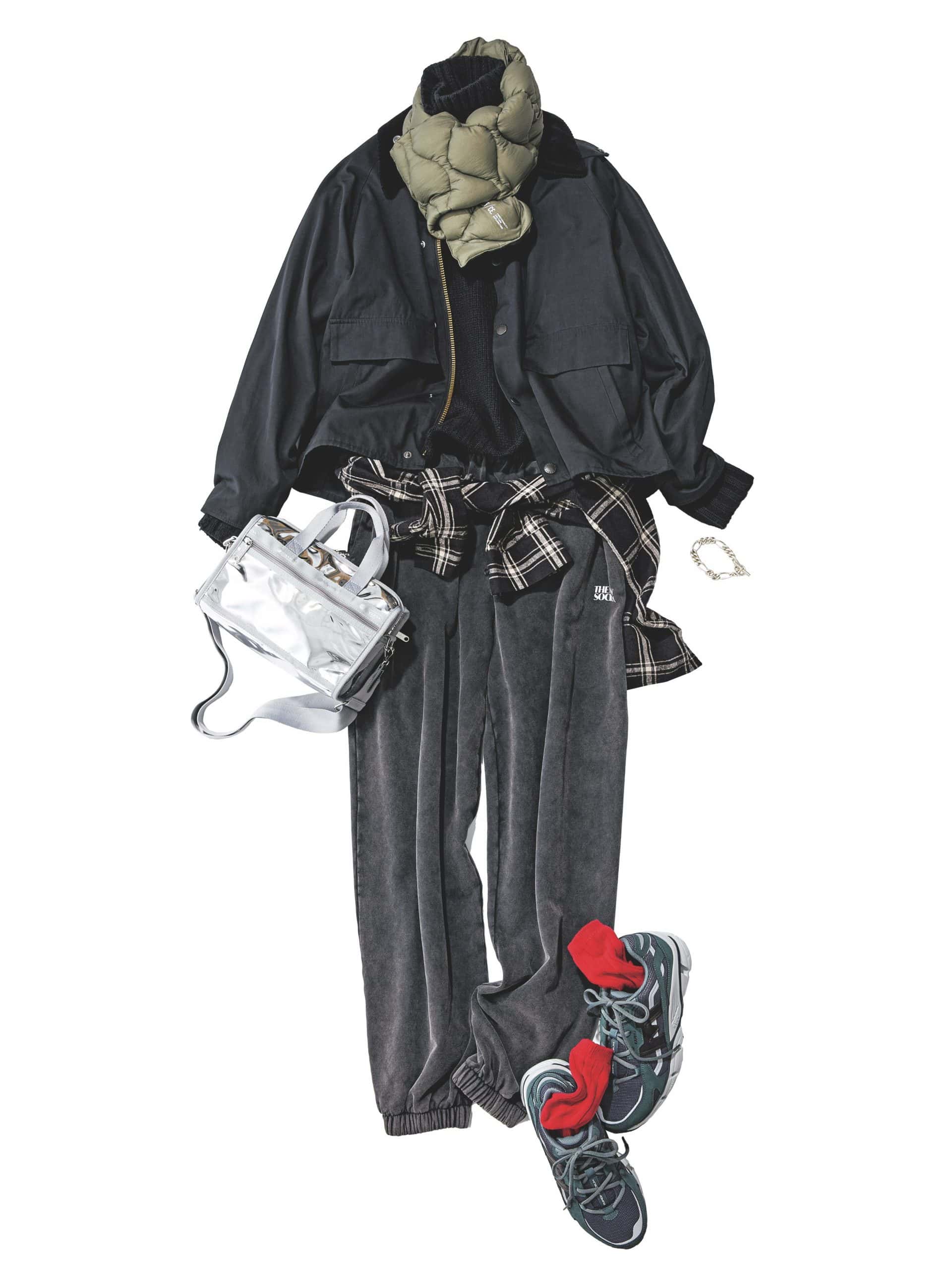 ダウンマフラー¥7,700(エフシーイー® × タイオン/F/CE. Flagship Store Tokyo)ハンティングジャケット¥47,300(バブアー × フリークス ストア/フリークス ストア 渋谷)ニット¥28,000(バナナ・リパブリック)シャツ¥55,000(プラームス フォー コンテ/コンテ 青山店)スウェットパンツ¥27,500(ザ ニュー ソサエティ/THIRD MAGAZINE)バッグ¥24,200(レスポートサック/レスポートサック カスタマーサービス)スニーカー¥19,800(カルフ/シードコーポレーション)ソックス¥880(靴下屋/タビオ)ブレスレット¥18,700(アドラル/ZUTTOHOLIC)