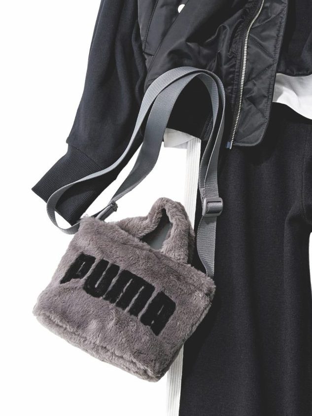 単調でシックなスタイルに最旬らしいファー素材がトレンド感を加えます。洒落感がアップするだけで、旅行マインドがグッと高まるはず。肩紐を外して手持ちにすれば、ガラッとイメチェンできて普段使いまで◎。