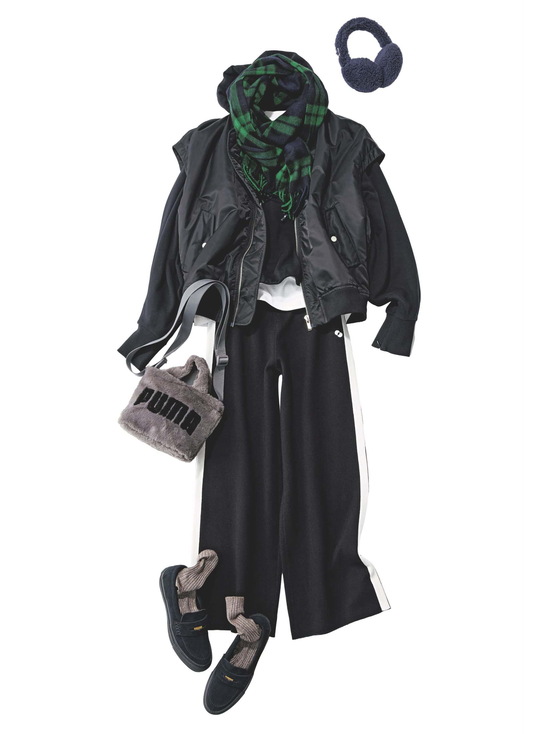 マフラー¥52,800(ジョシュアエリス/真下商事)ベスト¥39,600(アッパーハイツ/ゲストリスト)パーカ¥33,990(アストラット/アストラット 新宿店)Tシャツ¥9,900(アルページュストーリーオリジナル)ニットパンツ¥22,000(ルーニィ)バッグ¥6,160(プーマ)ローファースニーカー¥16,500(コンバース/コンバースインフォメーションセンター)イヤマフ¥33,000(ミュールバウアー/H.P.FRANCE)ソックス¥3,300(ブルーフォレ/リトルリーグ インク)