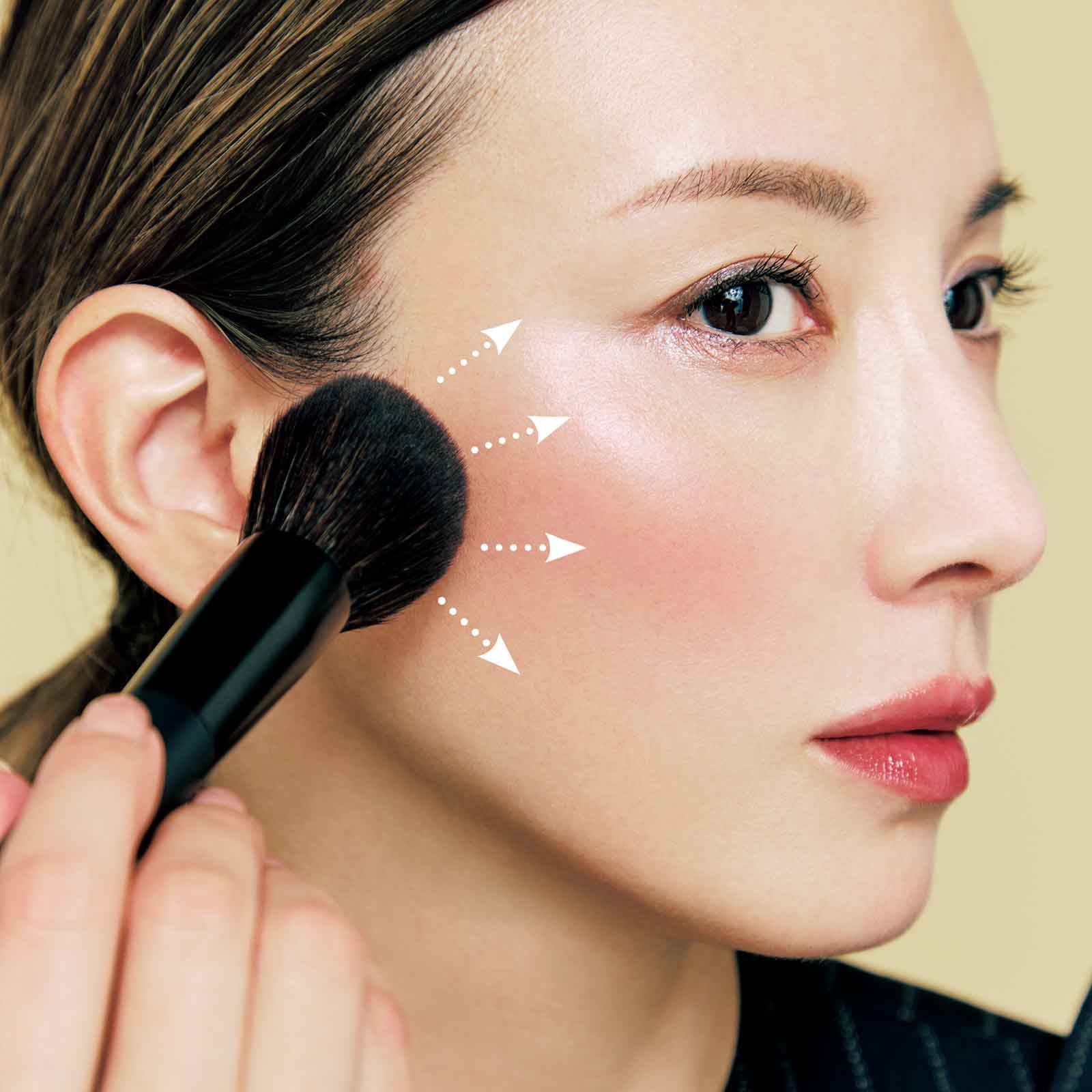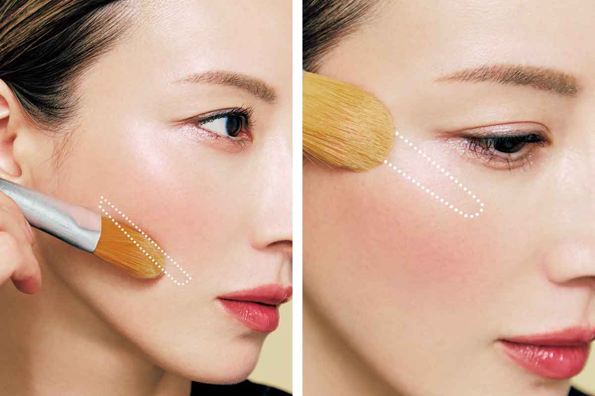 血色とパール感が効いたチークを丸ブラシで2周回しとったら、手の甲でトントンと余分な粉を落とします。目の下から耳前に1本ライン(上辺)を引き、鼻横から耳前に半円(下辺)を引いて繫げ、逆かまぼこ形を作ります。かまぼこの中もチークを馴染ませます。