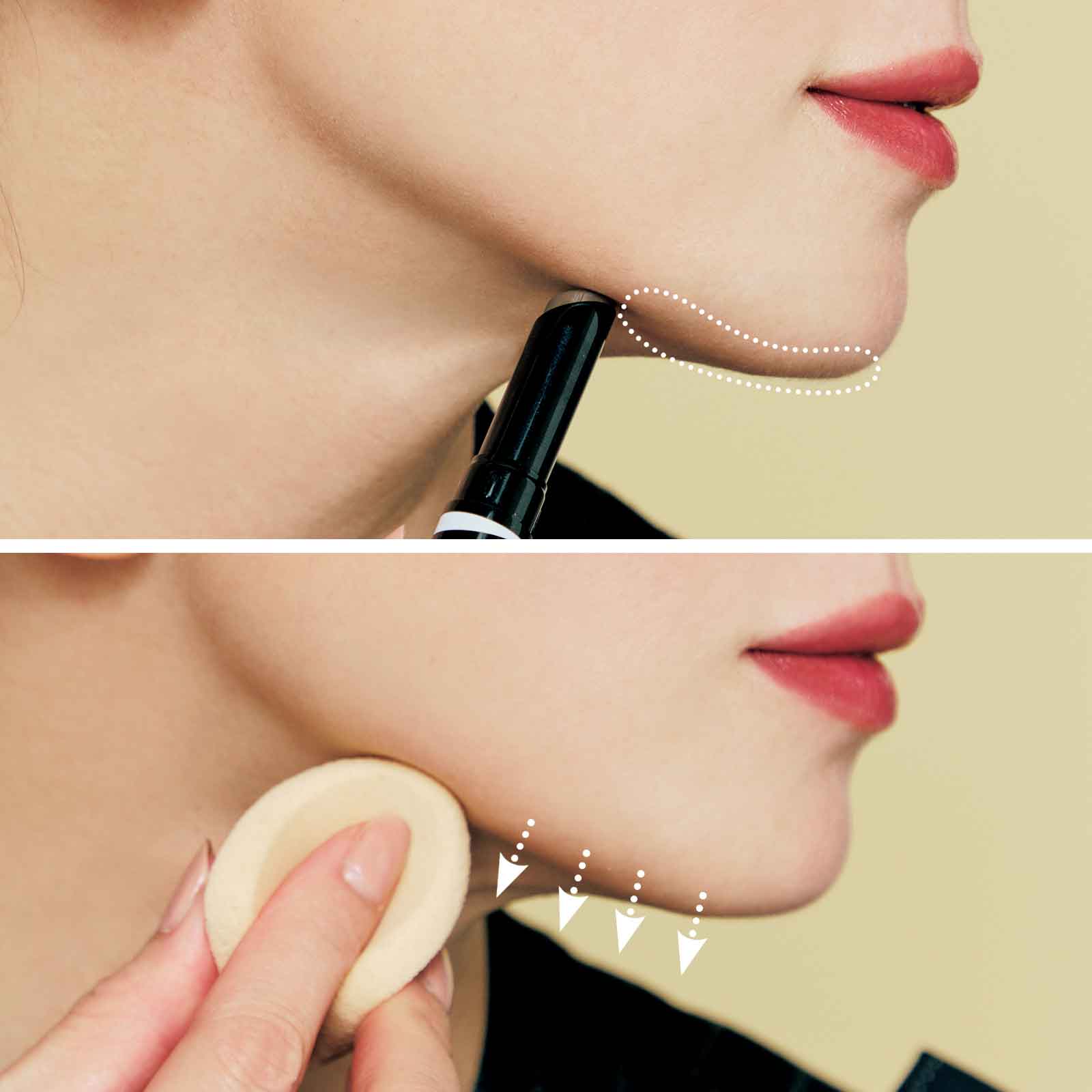お肉のたるみだけでなく、皮膚の緩みでも二重アゴに見えやすいアゴ先。耳下まで引かず、アゴ先から目尻下くらいまで、アゴ裏との境界線状にラインを引きます。アゴ裏に向かってスポンジでぼかし、輪郭のエッジを強調。